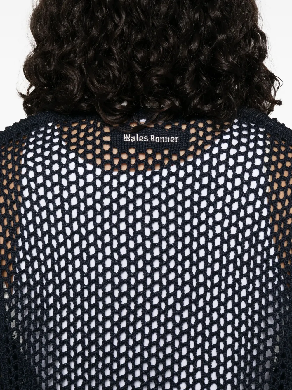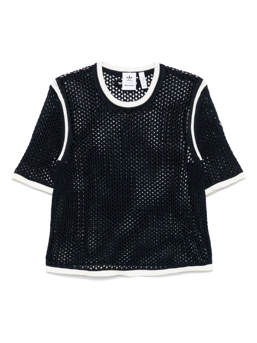 Tricou Adidas x Wales Bonner cotton-blend bleumarin, din bumbac mesh perforat, guler ribbed crewneck, maneci scurte, cusaturi fine, dungi contrastante specifice colaborarii Wales Bonner si logo brodat pe piept. Potrivit pentru sezonul toamna/iarna. 60% bumbac; 40% poliester.