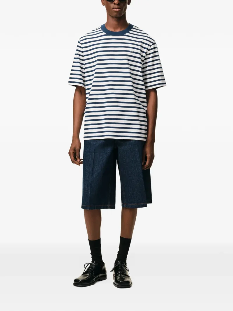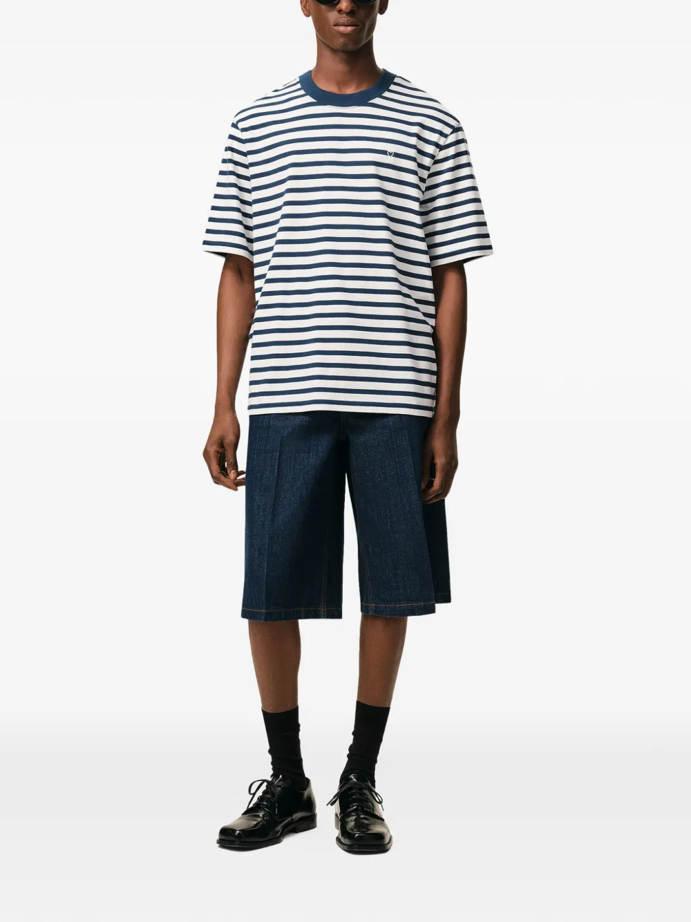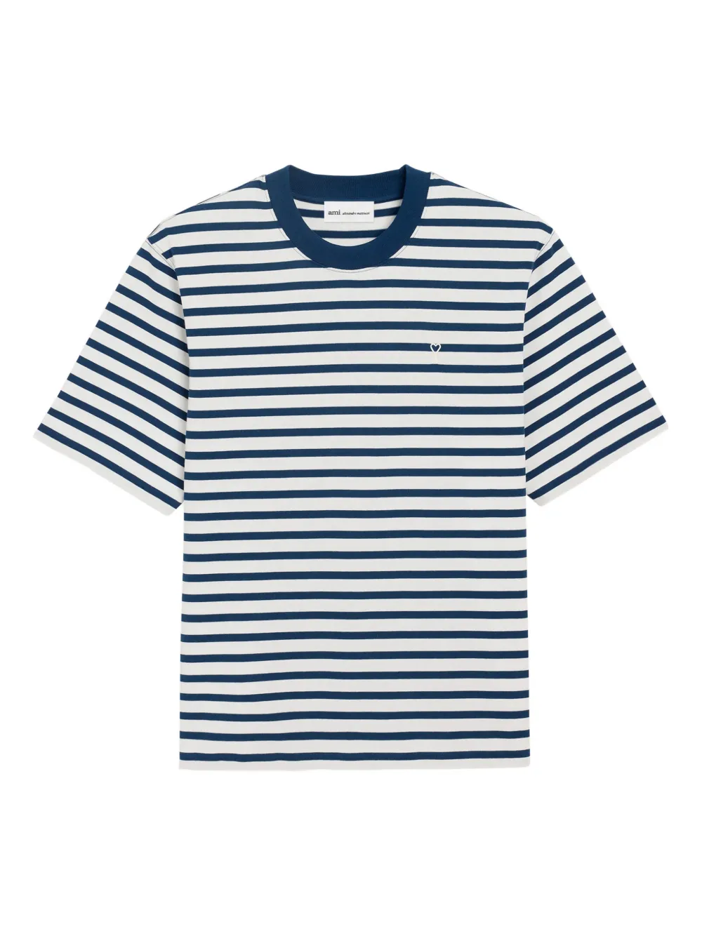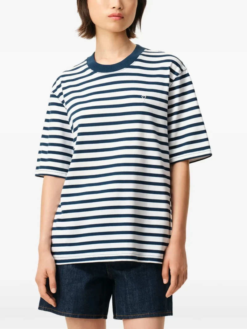 Tricou AMI Paris Ami De Coeur Patch alb, realizat din bumbac, cu guler crewneck, maneci scurte, grafica in dungi albastre, logo brodat la piept si tiv drept. Potrivit pentru sezonul primavara/vara. 100% bumbac.
