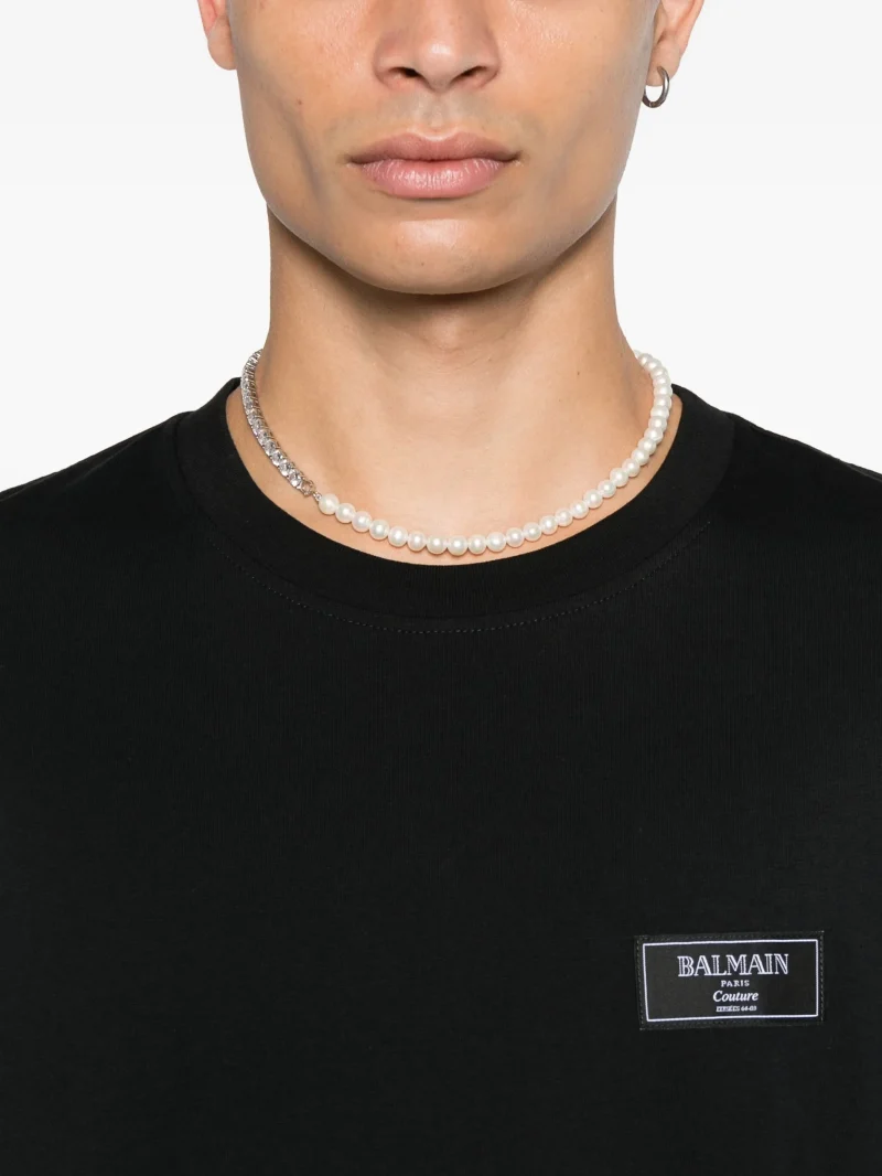 Tricou Balmain logo-motif negru, guler rotund, maneci scurte, tiv drept si logo imprimat pe partea din fata.100% bumbac