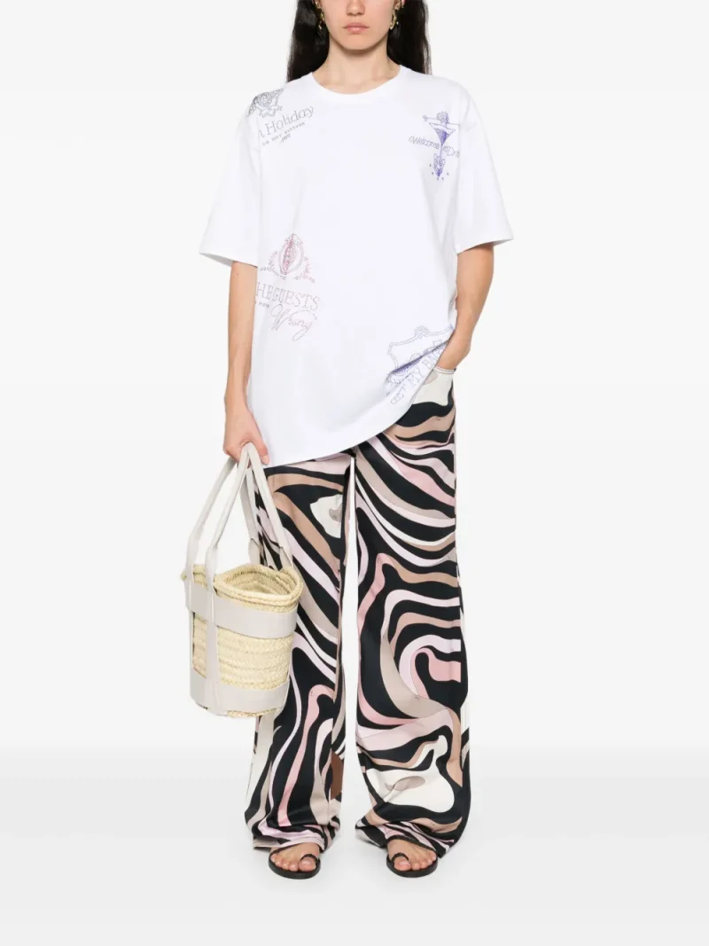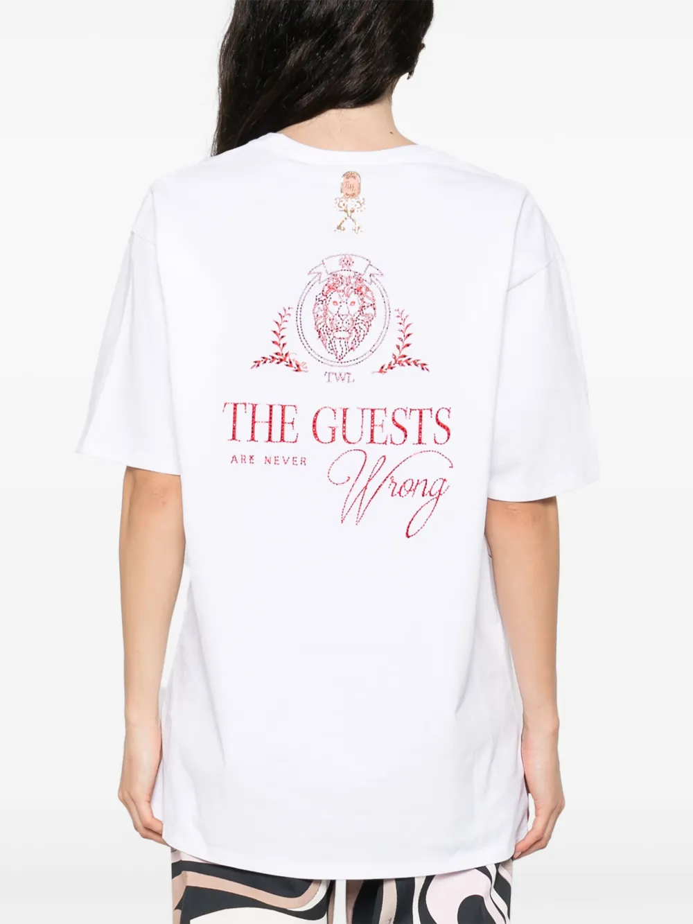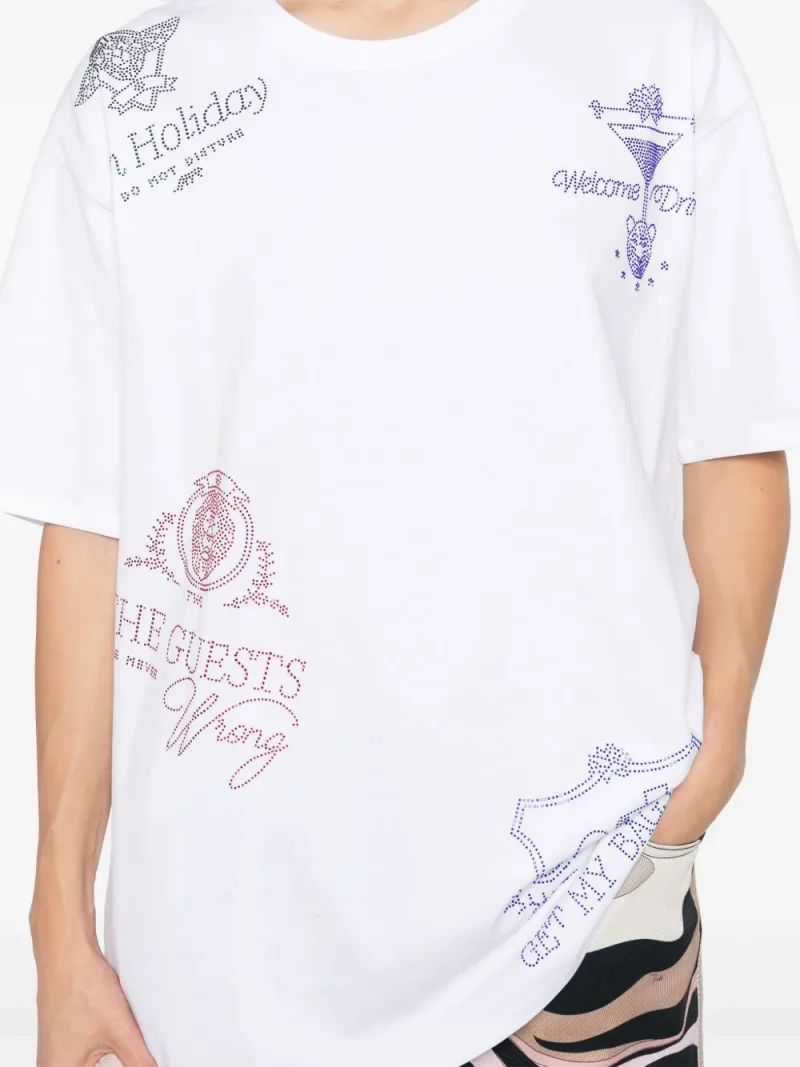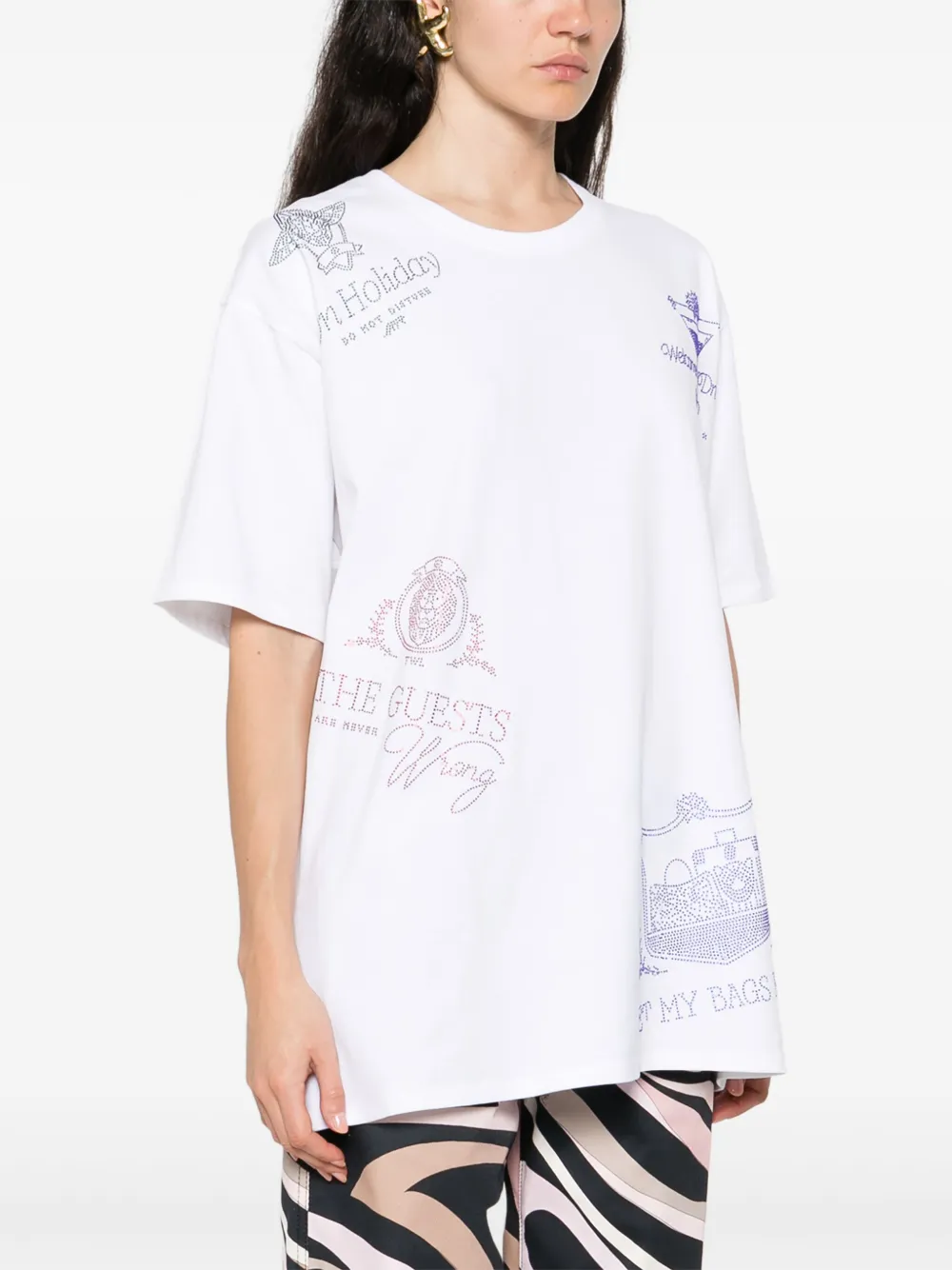 Tricou Camilla Welcome To The White Lotus alb, din bumbac, cu guler rotund, maneci scurte, cristale sclipitoare aplicate si tiv drept. Potrivit pentru sezonul primavara/vara. 100% bumbac.
