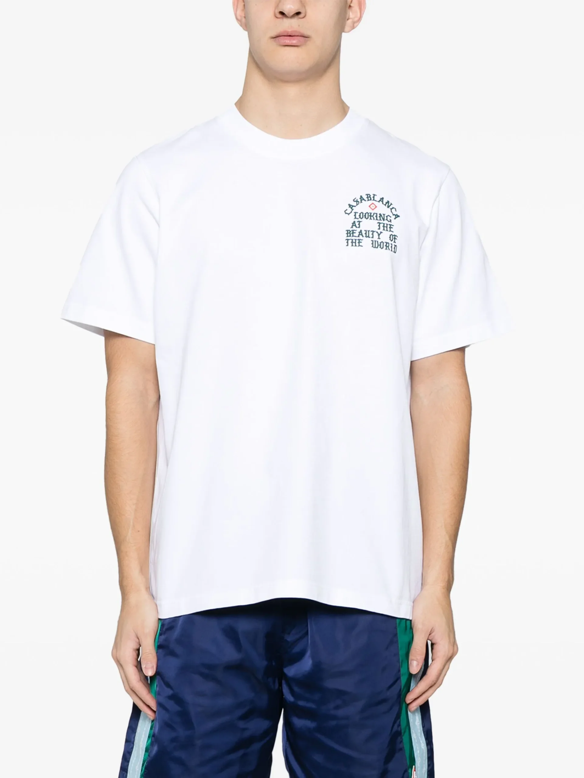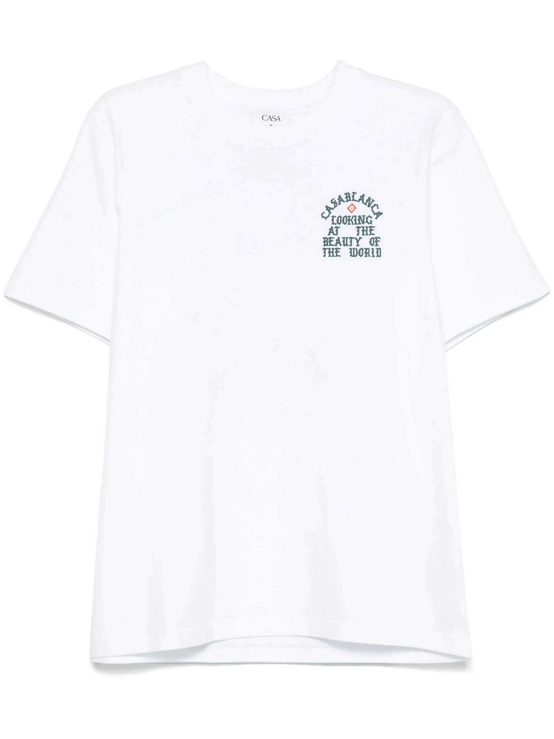 Tricou Casablanca „Beauty of The World” alb, guler rotund, imprimeu pe partea din fata si spate cu mesaj ” Looking at the beauty of the world” . 100% bumbac