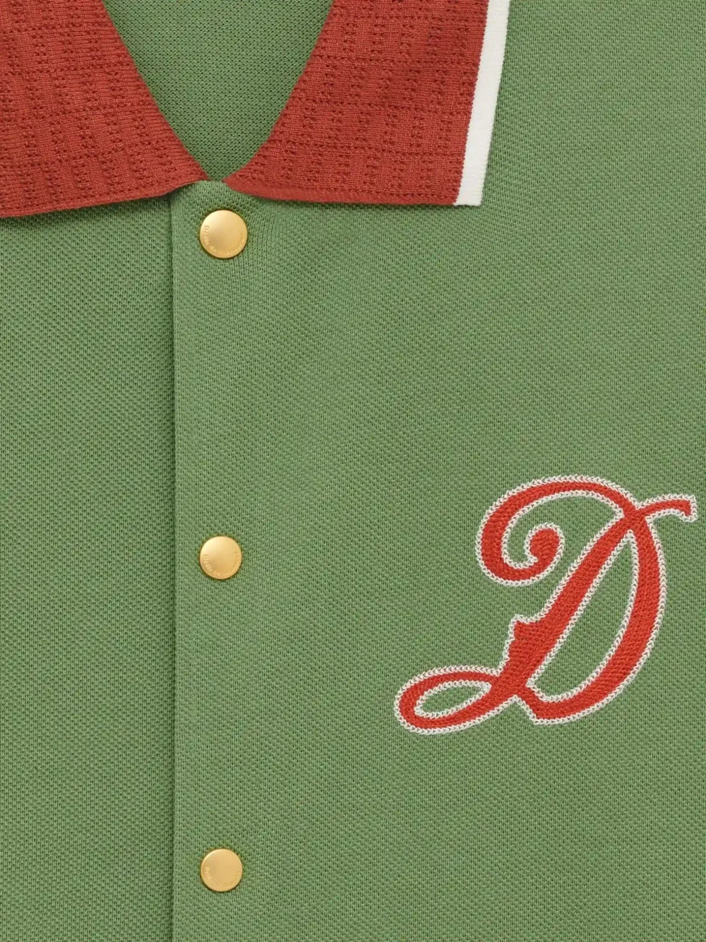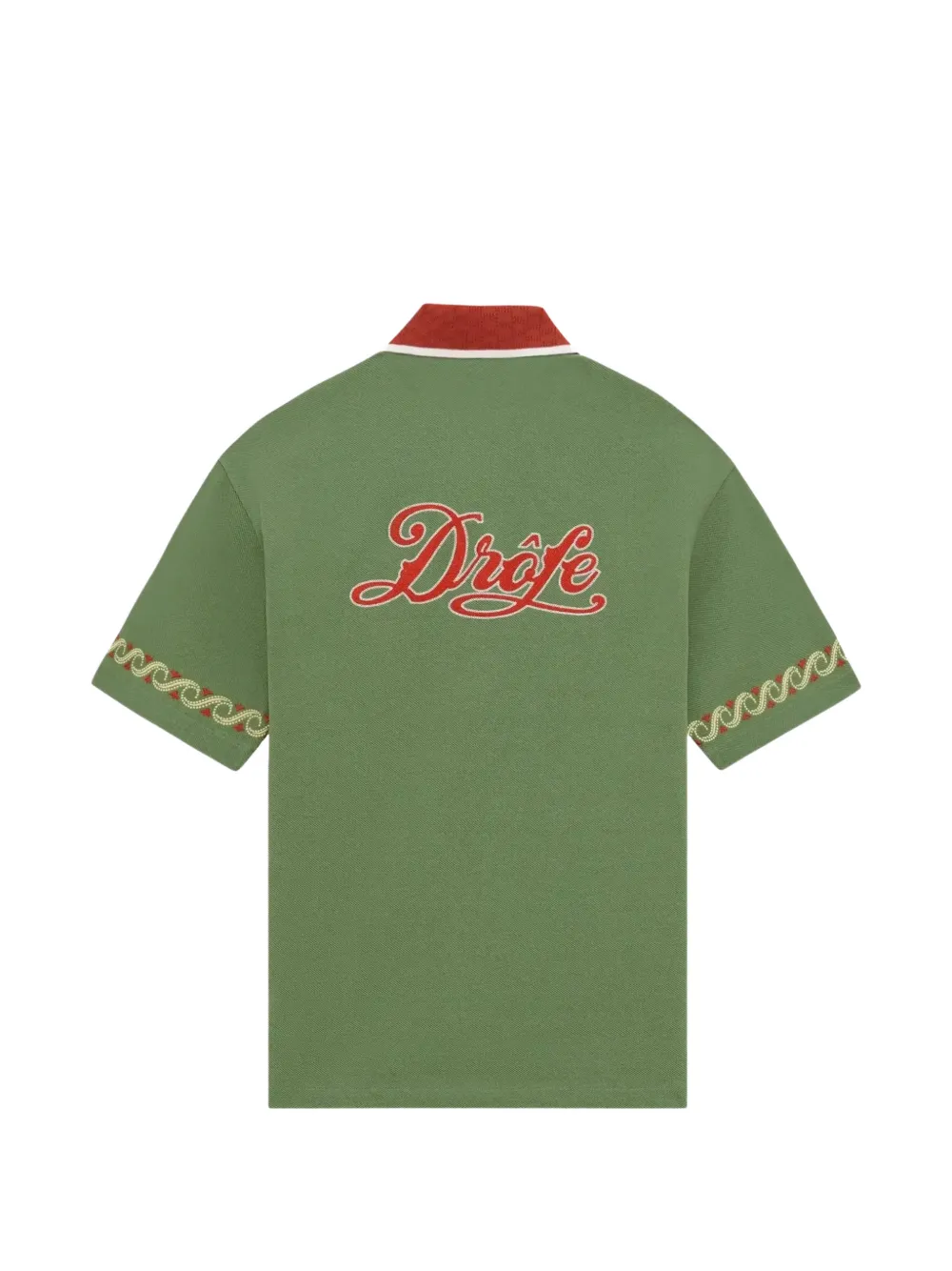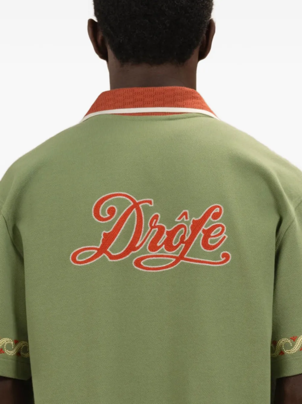Tricou Drole De Monsieur Logo-Embroidered verde, realizat din bumbac, cu guler tricotat, inchidere cu capse aurii gravate, maneci scurte decorate cu broderie Vagues, tesatura pique, broderie „D” Cuba pe piept si broderie Drole Cuba pe spate. Potrivit pentru sezonul primavara/vara. 100% bumbac.