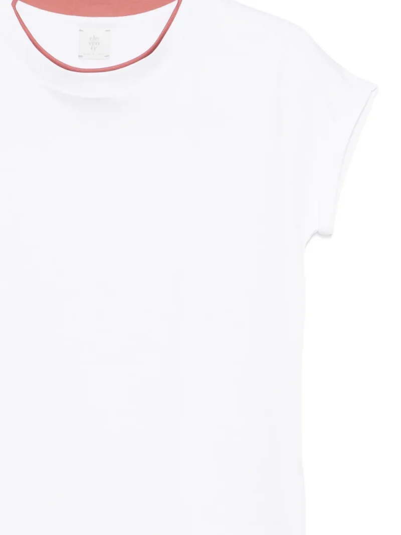 Tricou Eleventy Contrast Trim alb, realizat din bumbac, cu guler rotund in straturi si contrast, maneci scurte si tiv drept. Potrivit pentru sezonul primavara/vara. 100% bumbac.