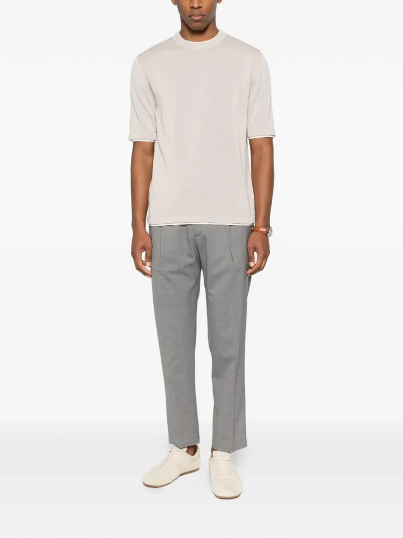 Tricou Eleventy Round Neck Trim bej, realizat din bumbac, cu guler crewneck, maneci scurte in straturi, tesatura jerse si tiv drept. Potrivit pentru sezonul primavara/vara. 100% bumbac.