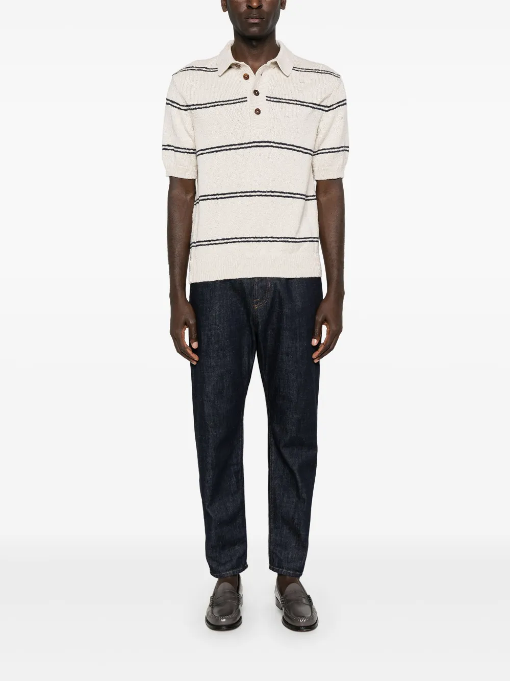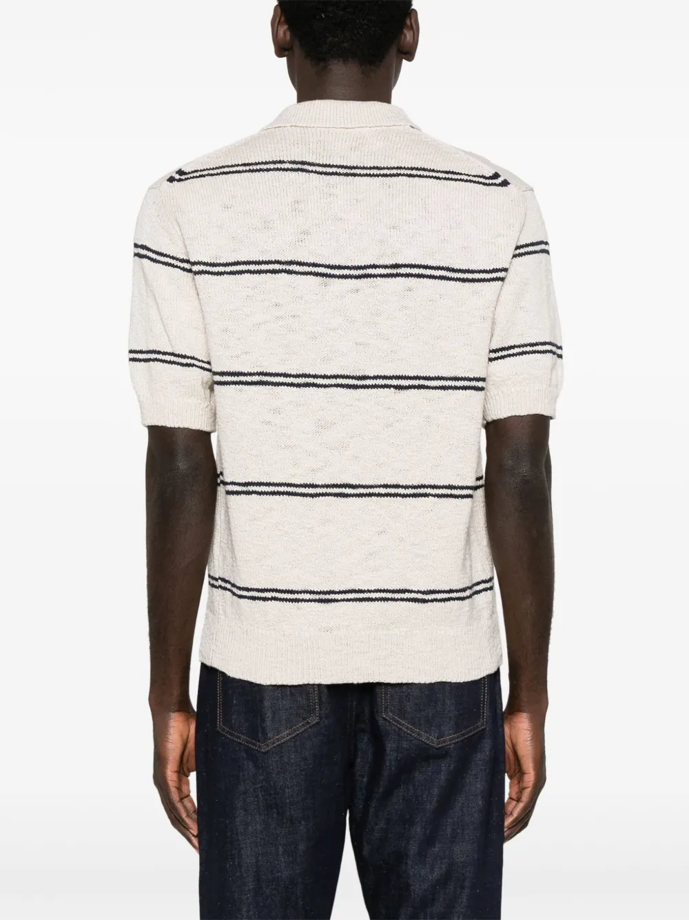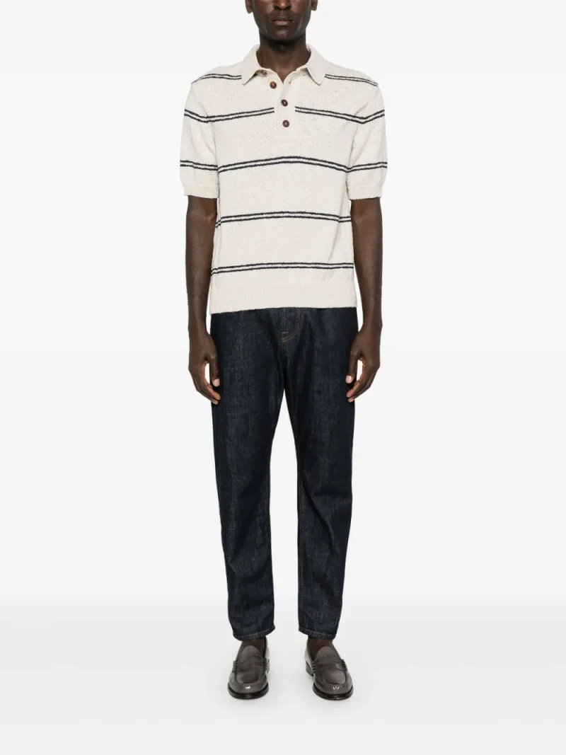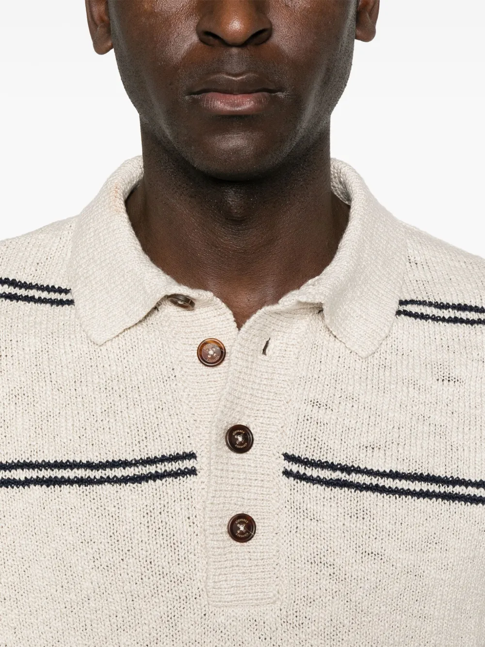 Tricou Eleventy Striped Polo bej, din bumbac, cu guler polo, inchidere partiala cu nasturi, maneci scurte, mansete elastice, grafica in dungi orizontale, constructie tricotata integral si tiv drept. Potrivit pentru sezonul primavara/vara. 100% bumbac.