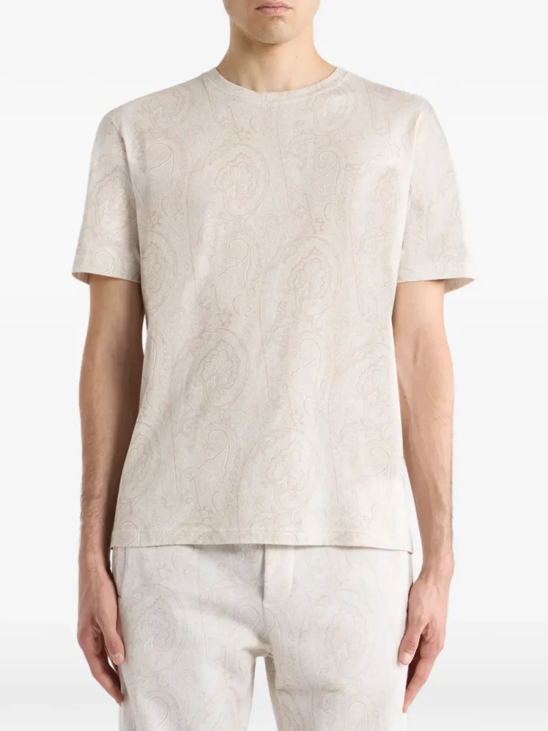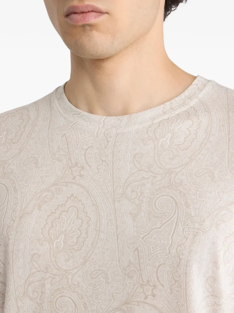 Tricou ETRO Arnica-Motif bej, realizat din bumbac, cu guler rotund, maneci scurte, grafica Paisley imprimata, logo brodat la piept si tiv drept. Potrivit pentru sezonul primavara/vara. 100% bumbac