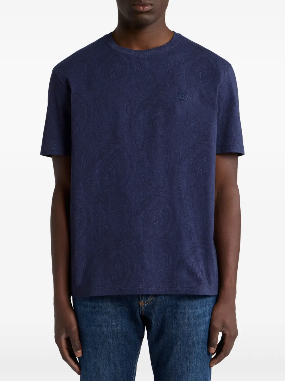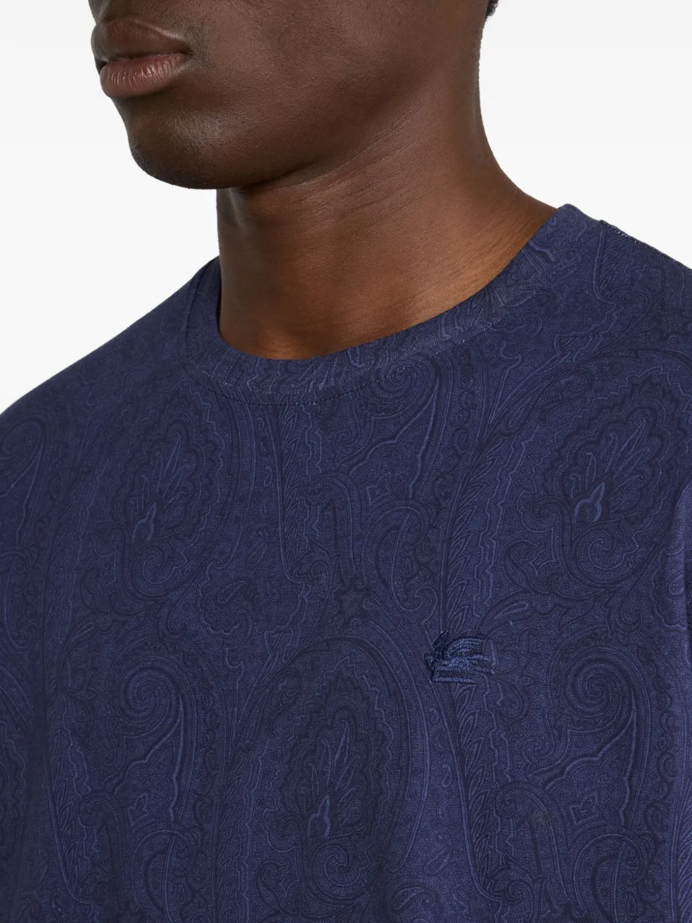 Tricou ETRO Arnica-Motif T-shirt bleumarin, realizat din bumbac, cu guler crewneck, maneci scurte, grafica Paisley imprimata pe toata suparfata si tiv drept. Potrivit pentru sezonul primavara/vara. 100% bumbac.