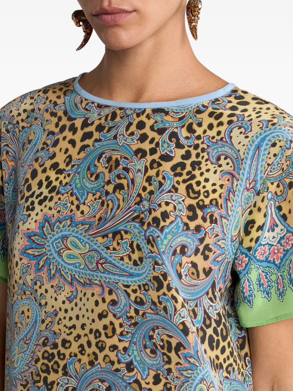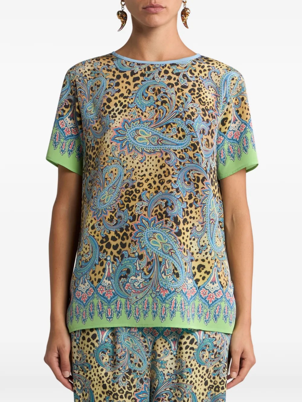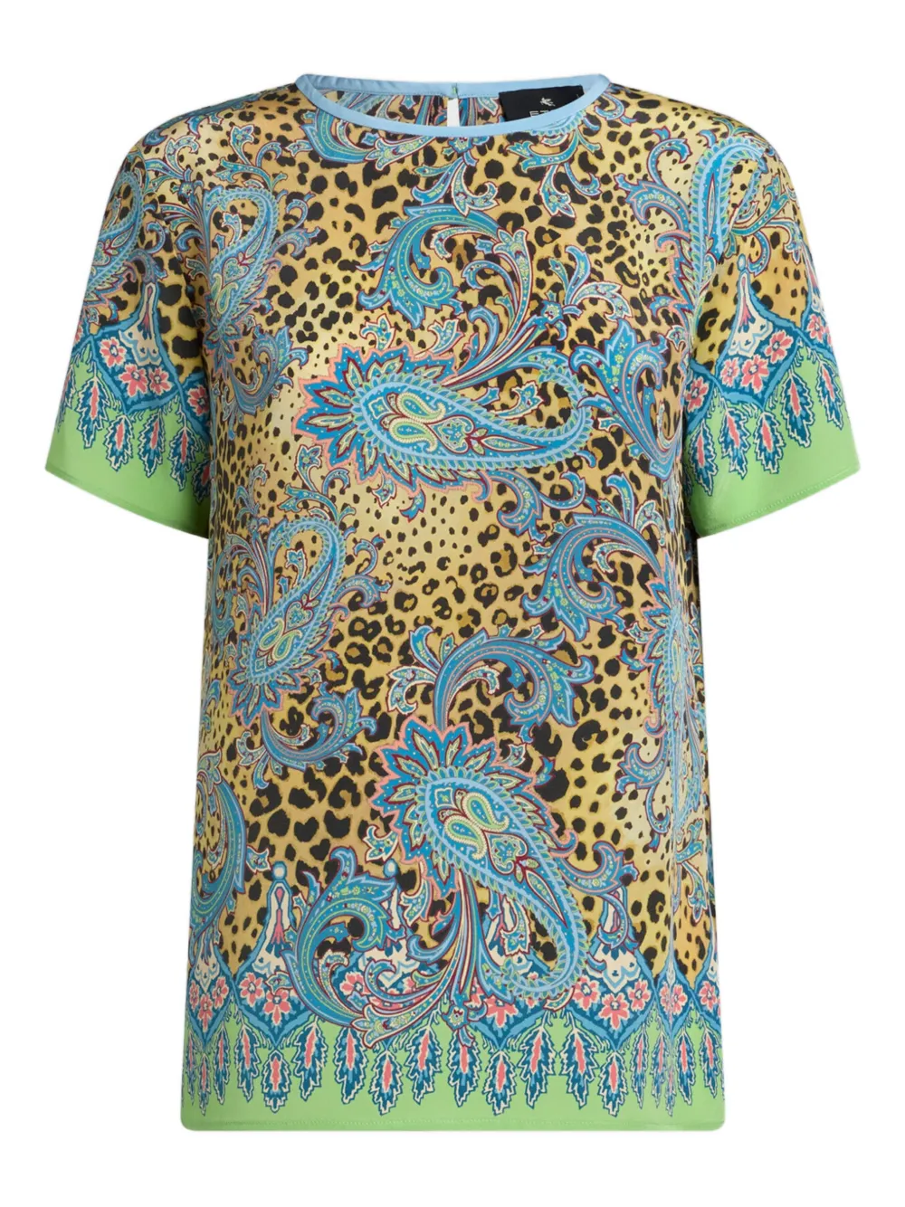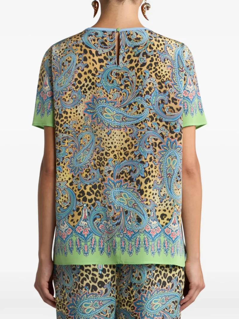 Tricou ETRO Paisley Animal-Motif multicolor, realizat din matase, cu guler crewneck, maneci scurte, grafica Leopard si Paisley imprimata si tiv drept. Potrivit pentriu sezonul primavara/vara. 100% matase.