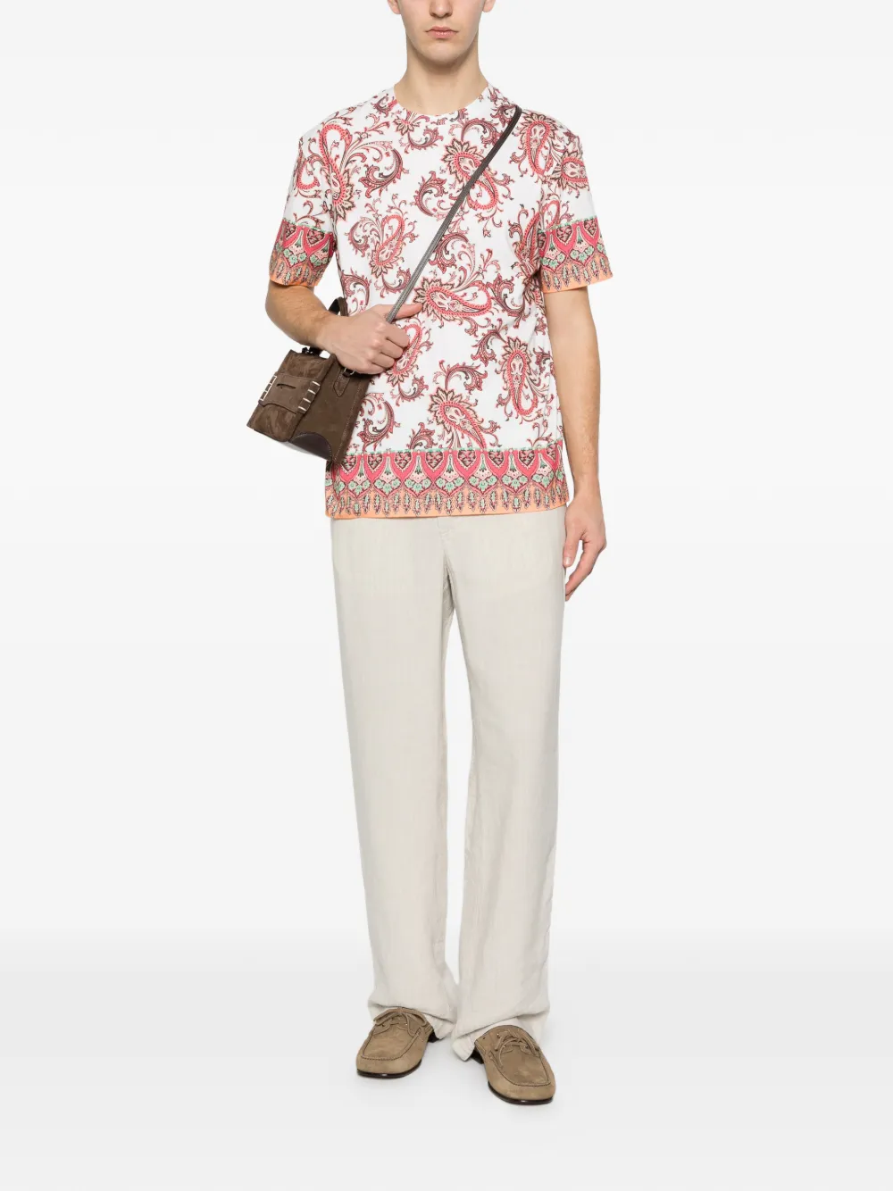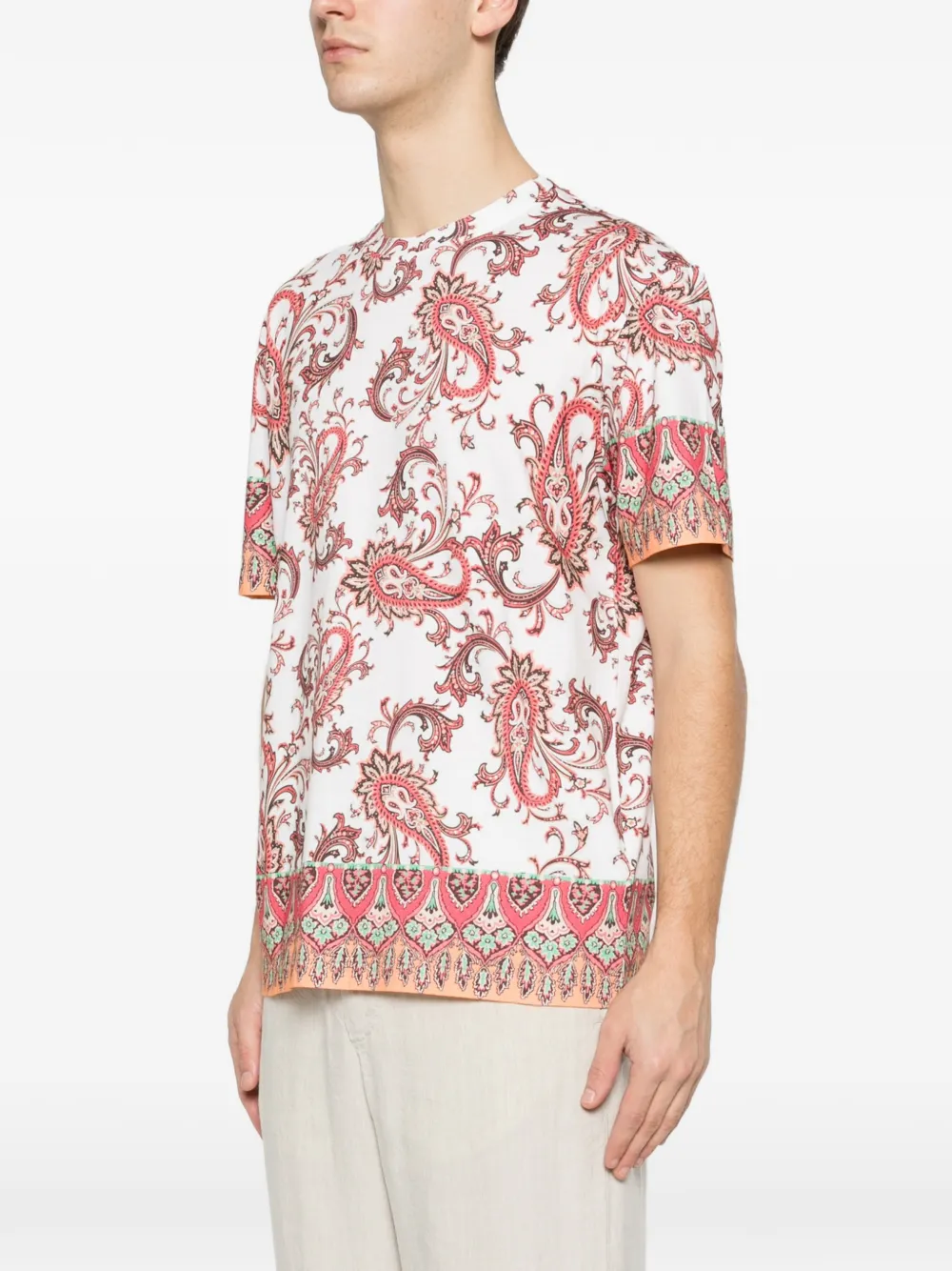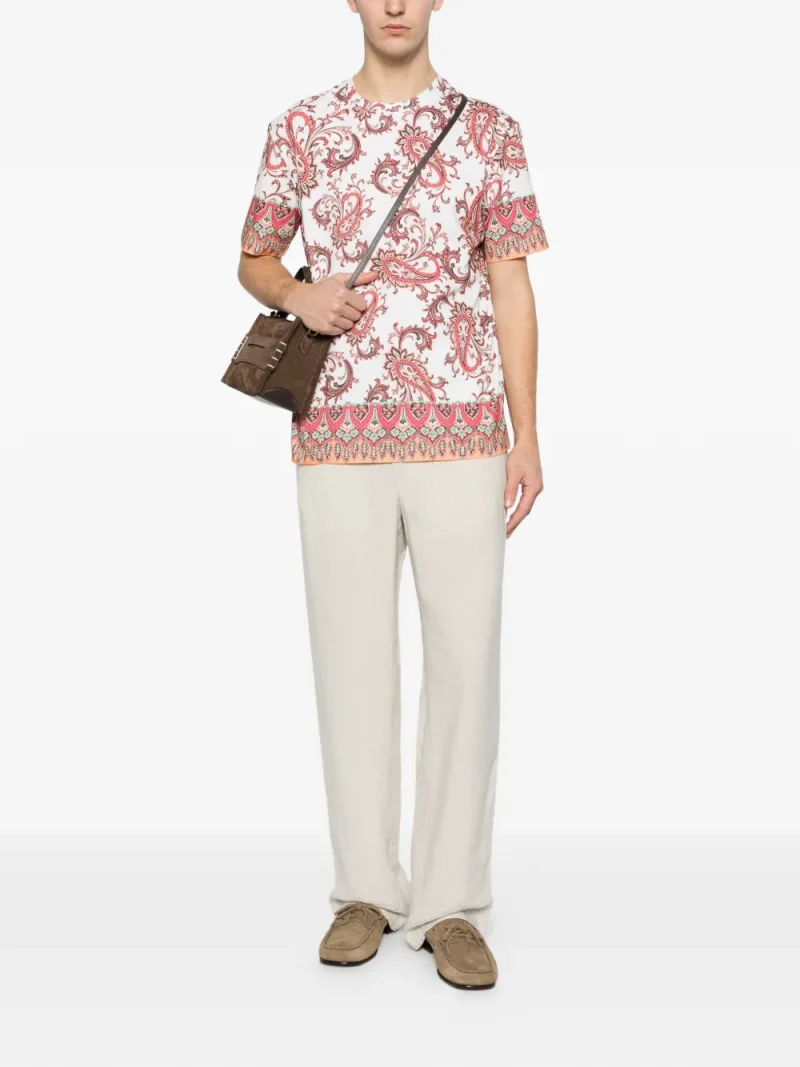Tricou ETRO Paisley Trim alb, realizat din bumbac, cu guler rotund, maneci scurte, grafica Paisley imprimata si tiv drept. Potrivit pentru sezonul primavara/vara. 100% bumbac.
