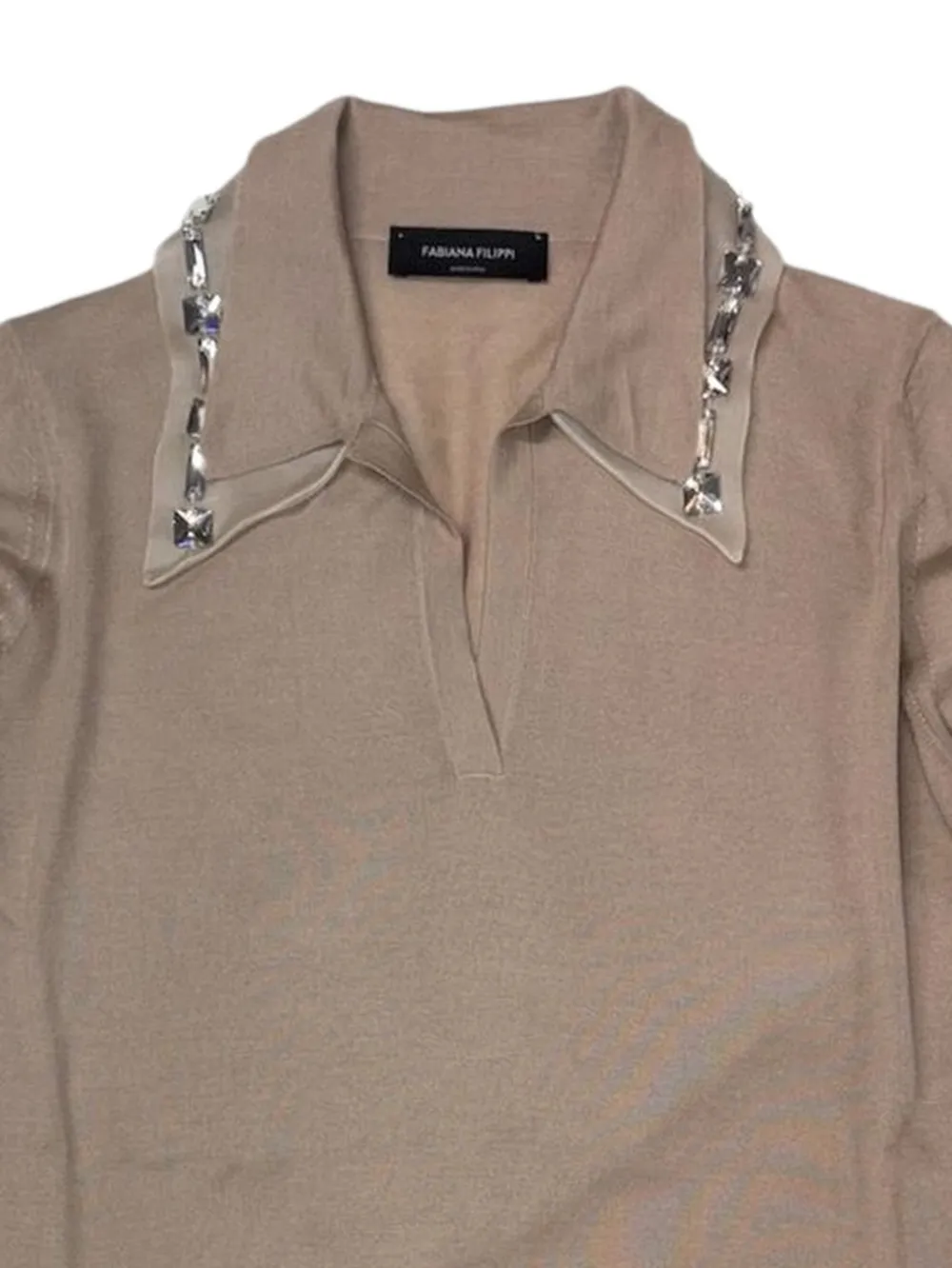 Tricou Fabiana Filippi Collar-Embellished maro, tricotat din casmir, cu guler clasic si deschidere in V, maneci scurte, decorat cu cristale sclipitoare si tiv drept. Potrivit pentru sezonul primavara/vara. 70% casmir; 30% matase.