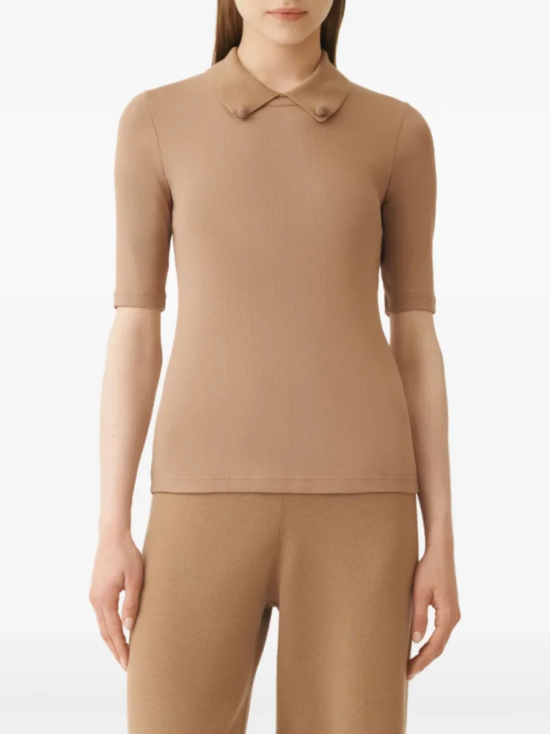 Tricou Fabiana Filippi Embellished-Collar Short-Sleeve maro, cu guler polo tricotat si butoni aplicati, maneci scurte, croiala stramta si tiv drept. Potrivit pentru sezonul toamna/iarna. 94% bumbac; 6% elastan.
