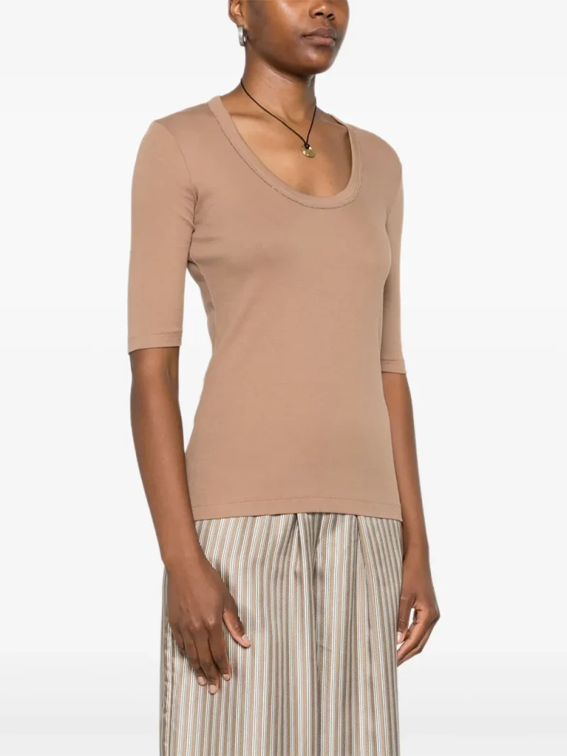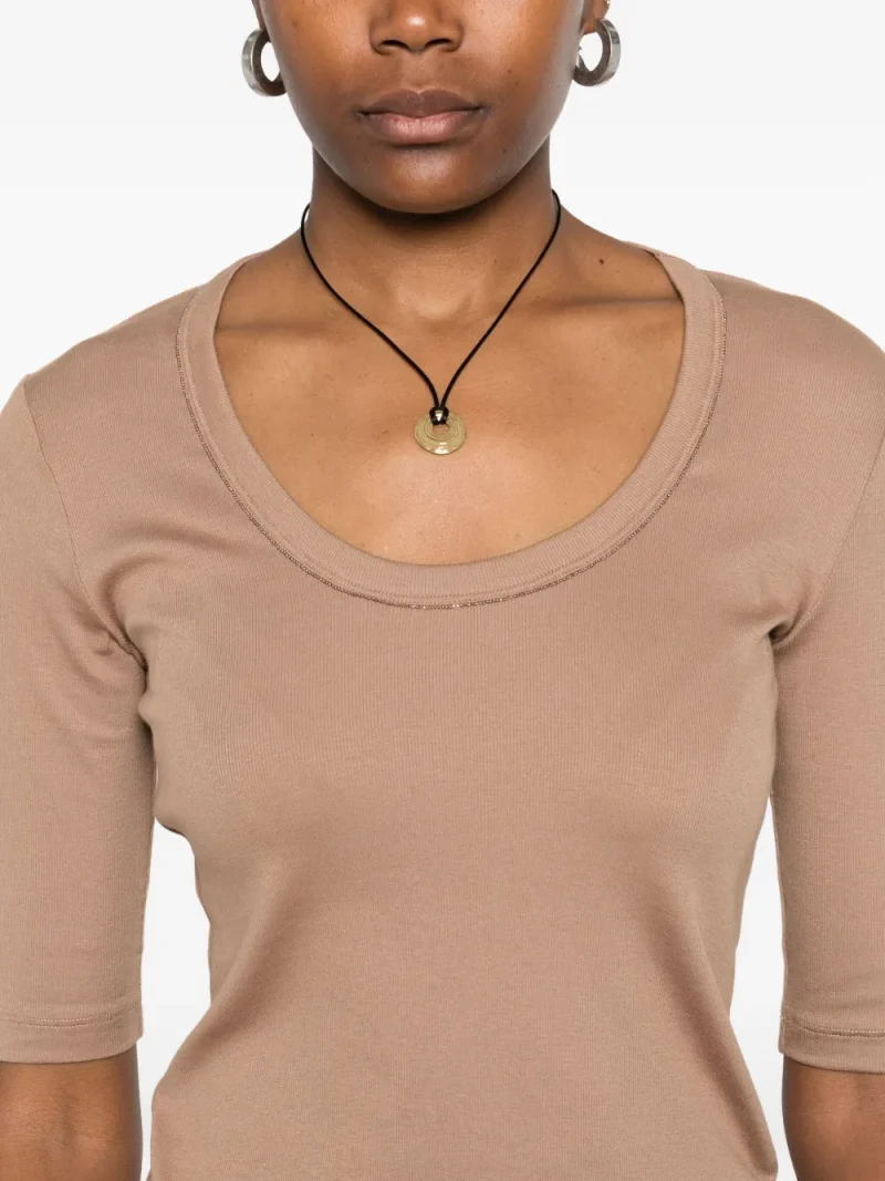 Tricou Fabiana Filippi Embellished Neckline maro decorat cu fibre metalice, decolteu rotund, maneci medii si tiv drept. Potrivit pentru sezonul toamna/iarna. 94% bumbac; 6% elastan.