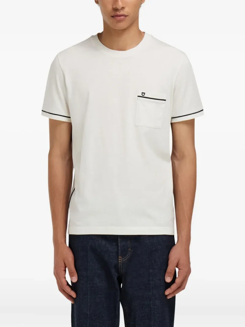 Tricou Ferragamo Pocket Gancini Trim alb, realizat din bumbac si casmir, cu guler crewneck, maneci scurte, buzunar aplicat la piept cu logo Gancini brodat si dungi decorative in contrast. Potrivit pentru sezonul primavara/vara. 80% bumbac; 20% casmir.