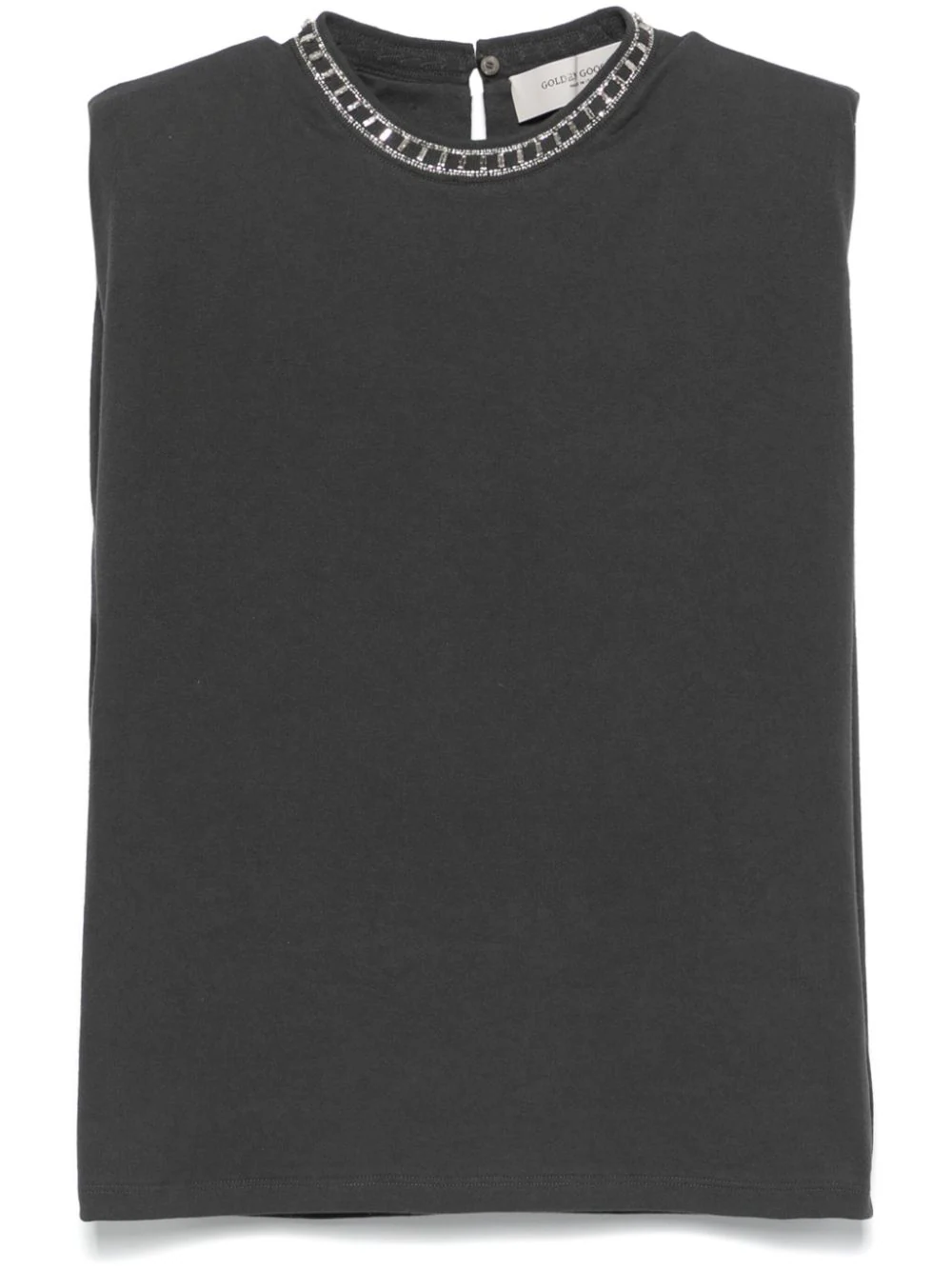 Tricou Golden Goose Isabel gri, din bumbac, cu guler rotund decorat cu cristale sclipitoare, fara maneci, umeri supradimensionati, dungi in tesatura si tiv drept. Potrivit pentru sezonul toamna/iarna. 100% bumbac.