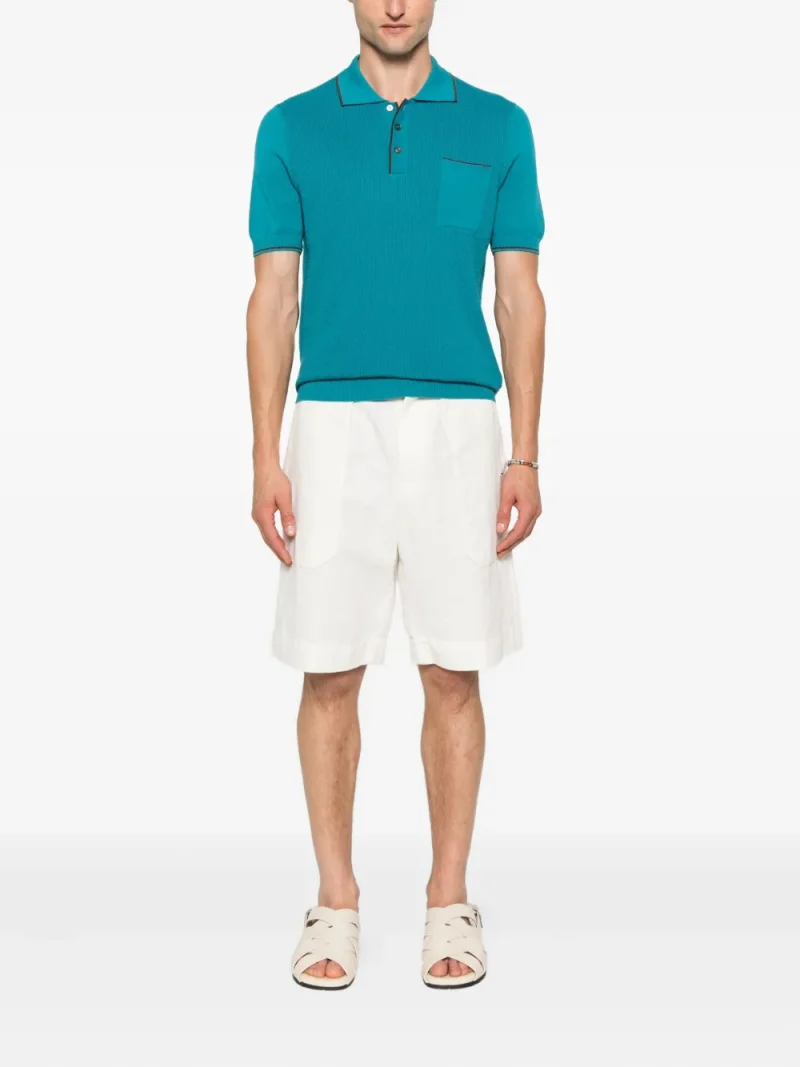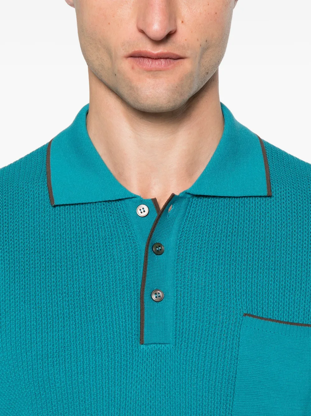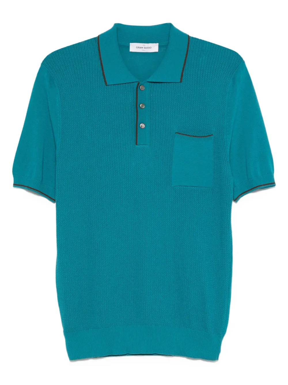 Tricou Gran Sasso Ribbed Pocketed turcoaz, din bumbac, cu guler polo, inchidere partiala uc nasturi, maneci scurte, detalii cu dungi in contrast, buzunar aplicat la piept si tiv ribbed. Potrivit pentru sezonul toamna/iarna. 100% bumbac.