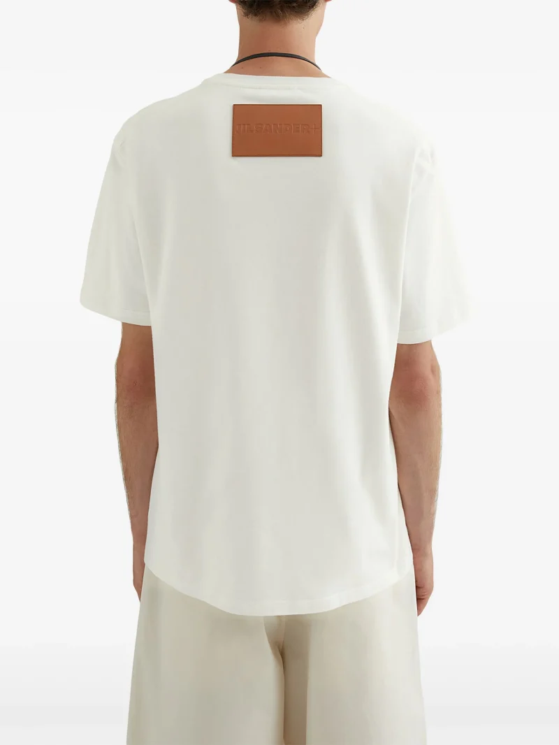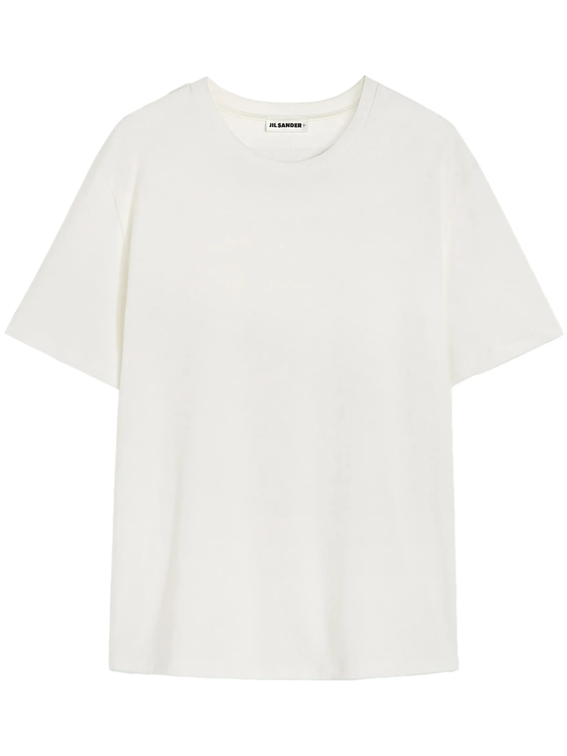 Tricou Jil Sander crew-neck alb, din bumbac cu textura jersey, cu guler rotund, maneci scurte, patch cu logo pe spate si tiv drept. 100% bumbac