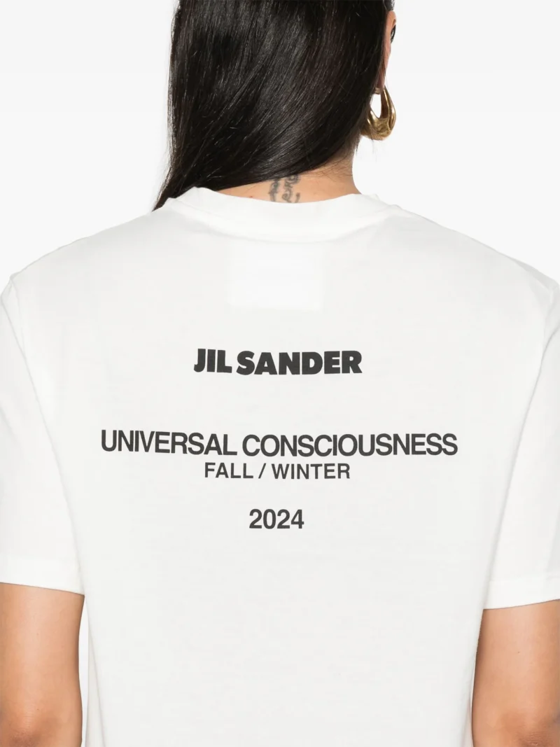Tricou alb din bumbac, cu guler rotund, maneci scurte, logo si imprimeu JIL SANDER pe partea din spate si tiv drept. Potrivit pentru sezonul toamna/iarna. 100% bumbac.