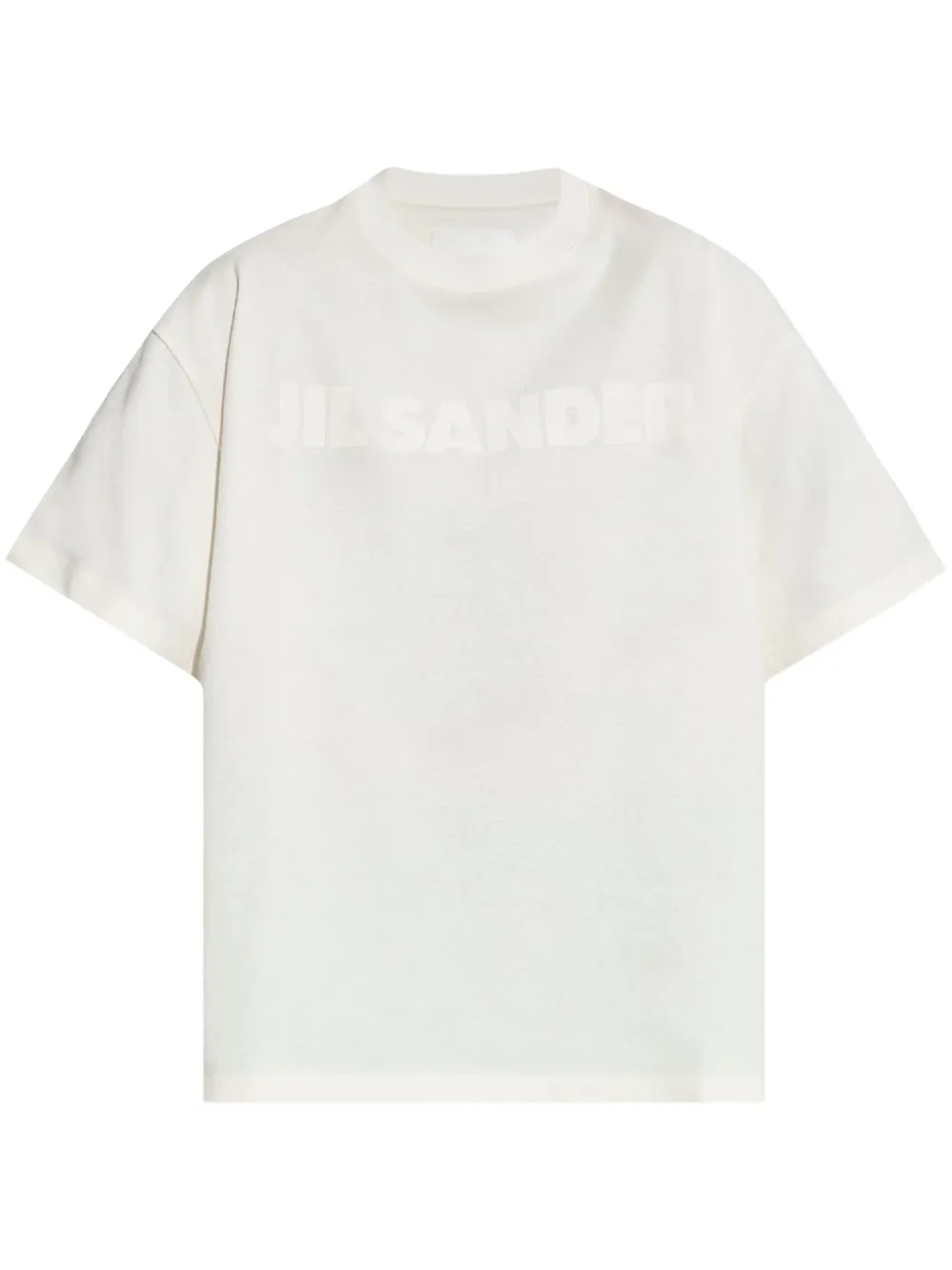 Tricou JIL SANDER Logo-Print alb, oversized-fit, din bumbac dens, cu guler crewneck, maneci medii, grafica supradimensionata JIL SANDER imprimata pe partea din fata si tiv drept. Potrivit pentru sezonul primavara/vara. 100% bumbac.