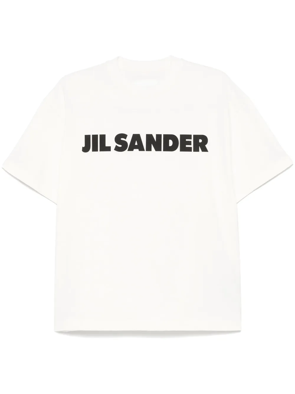 Tricou JIL SANDER Logo-Print alb, din bumbac dens, oversized-fit, cu guler crew-neck, maneci medii, logo JIL SANDER imprimat pe partea din fata si tiv drept. Potrivit pentru sezonul primavara. 100% bumbac.