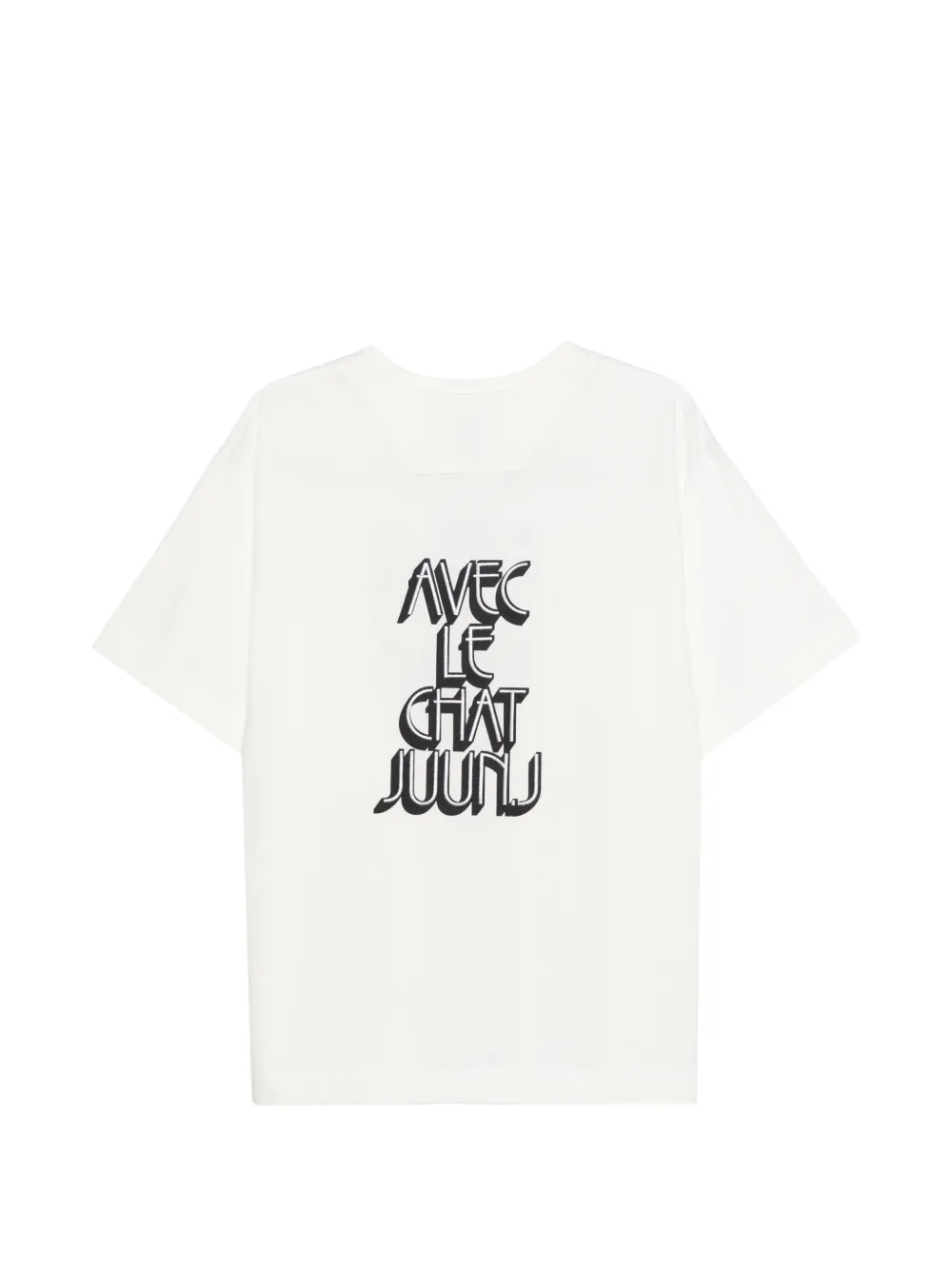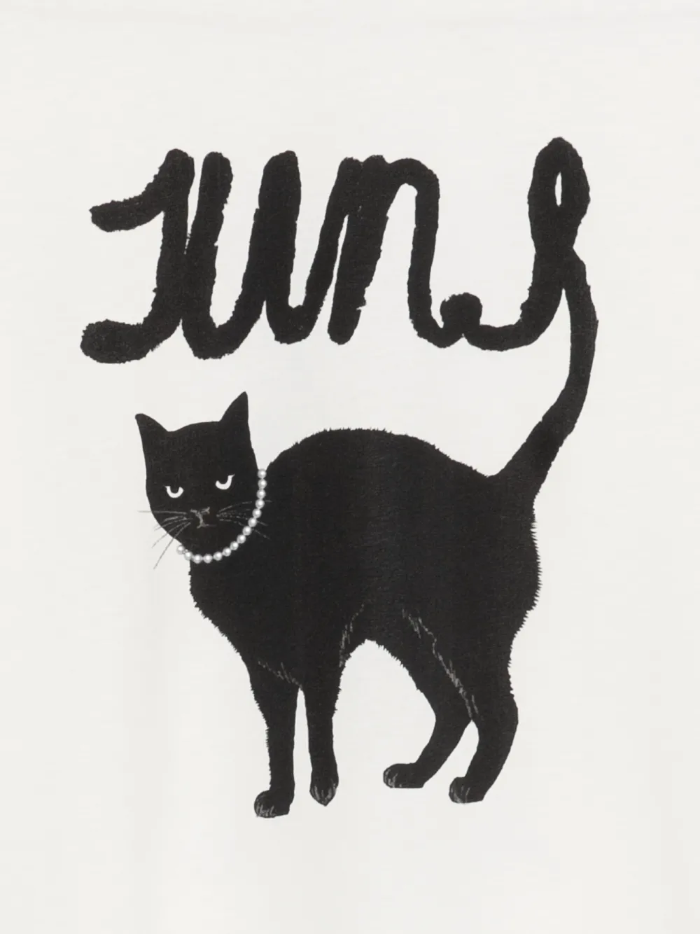 Tricou JUUN.J Cat-Print alb, realizat din bumbac, cu umeri cazuti, maneci scurte, grafica Cat imprimata ca element central, logo dispus fluid, mesaj „Avec le chat” pe spate si tiv drept. Potrivit pentru sezonul primavara/vara. 100% bumbac,