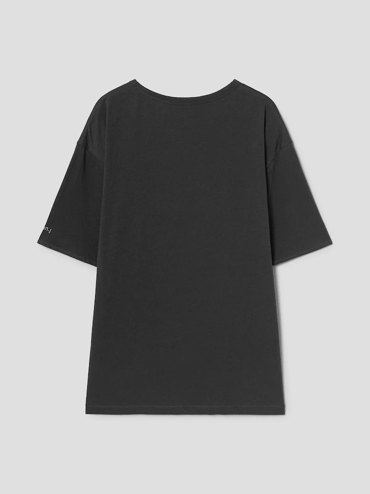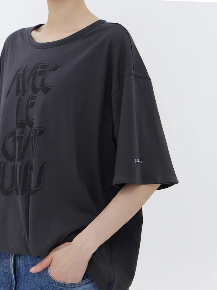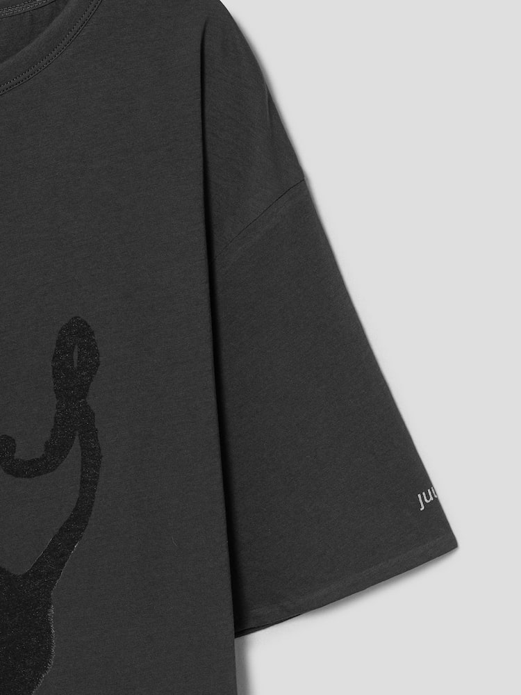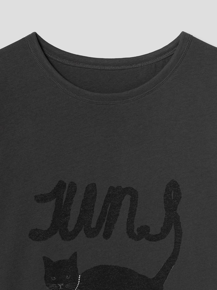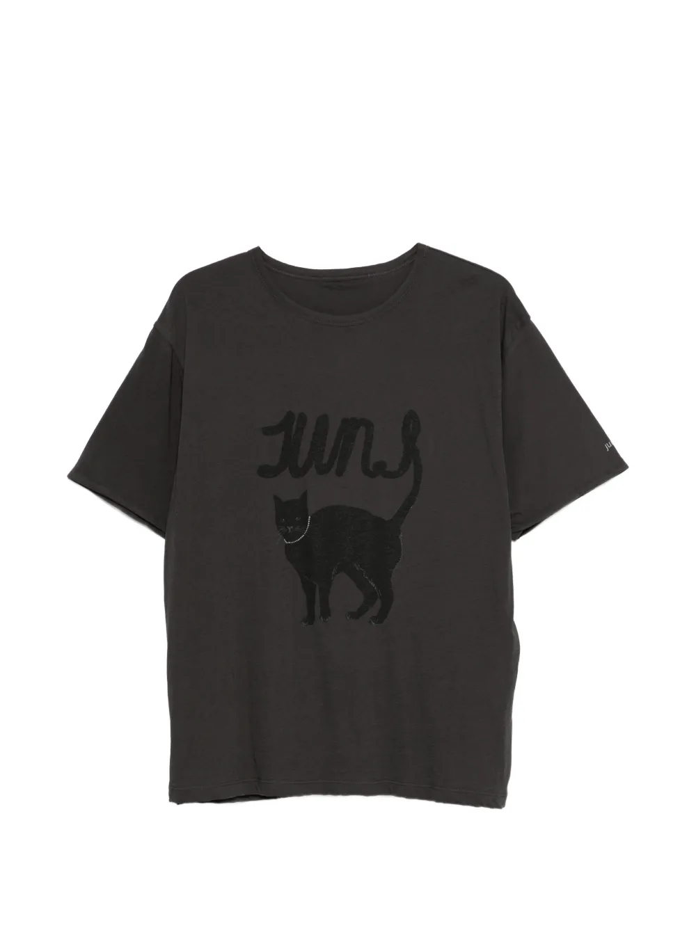 Tricou JUUN.J Cat-Print gri, realizat din bumbac moale, cu guler rotund, umeri cazuti, maneci scurte, reversibil fata/verso cu grafica statement Juncat si tiv drept. Constructia reversibila iti permite sa porti diferit grafica Juncat si letteringul AVEC LE CHAT JUUN.J, in functie de stilul tau. 100% bumbac.