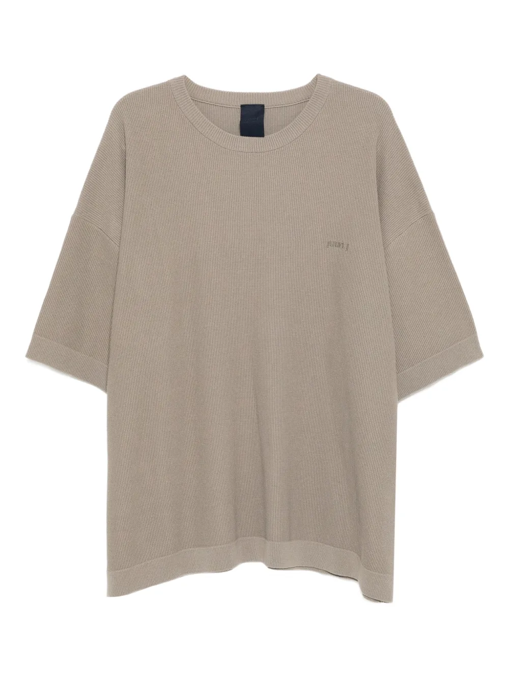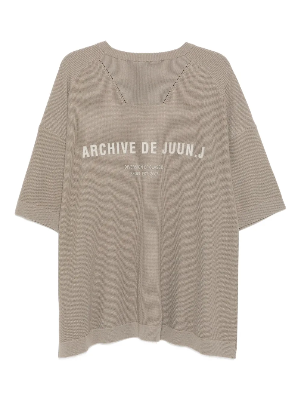 Tricou Juun.J Logo-Embroidered khaki, tricotat din bumbac, cu umeri cazuti, maneci medii, logo brodat la piept, grafica „Archive Juun.J” pe spate si tiv drept. Potrivit pentru sezonul toamna/iarna. 55% bumbac; 43% acrilic; 2% nailon.