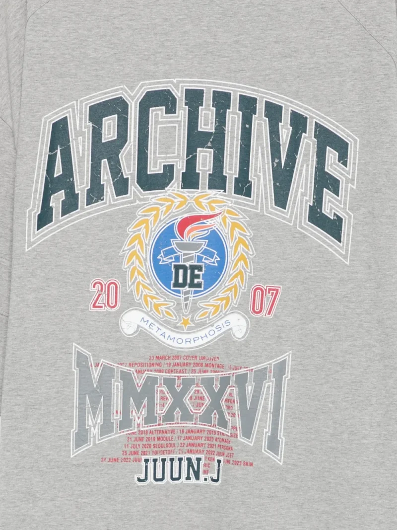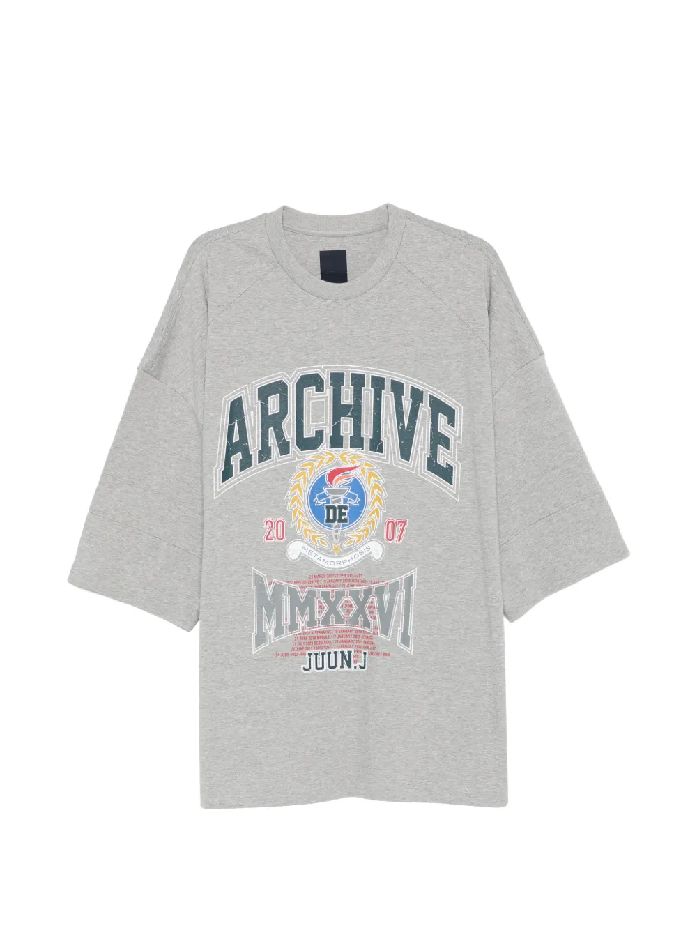 Tricou JUUN.J Printed gri, realizat din bumbac, oversized-fit, cu umeri cazuti, maneci scurte, grafica Arhive Metamorphosis imprimta si tiv drept. Potrivit pentru sezonul primavara/vara. 100% bumbac.