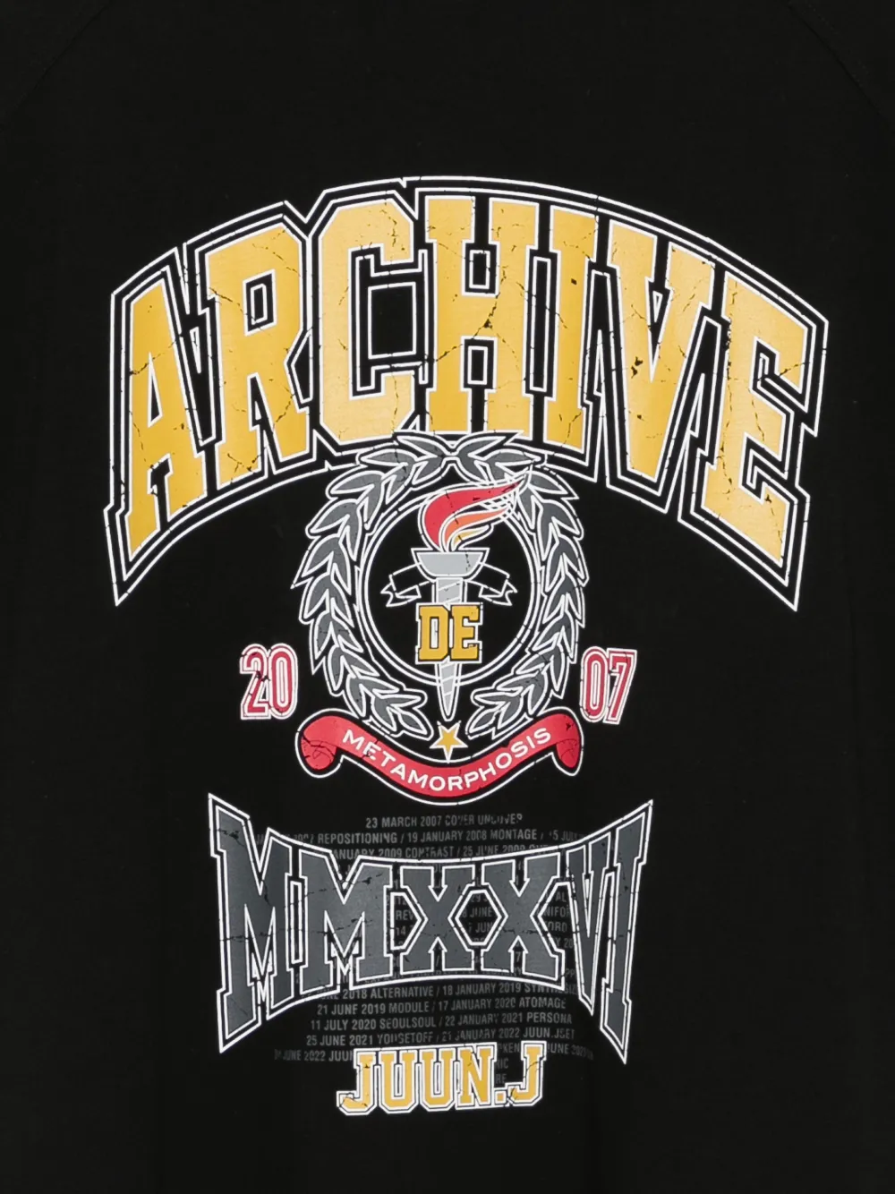 Tricou JUUN.J Printed negru, realizat din bumbac, oversized-fit, cu umeri cazuti, maneci scurte, grafica Arhive Metamorphosis imprimta si tiv drept. Potrivit pentru sezonul primavara/vara. 100% bumbac.