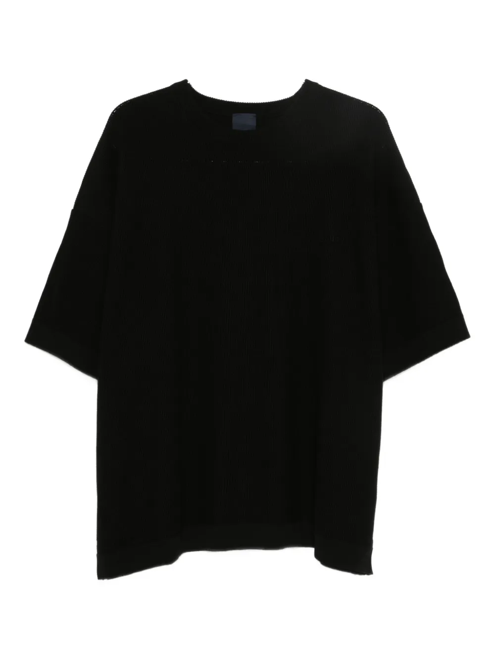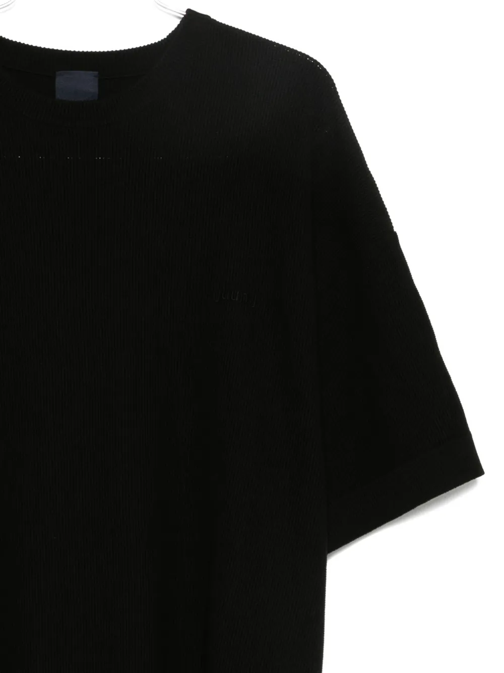 Tricou Juun.J Ribbed negru, cu guler crewneck, umeri cazuti, maneci scurte, gafica „Archive de Juun.J” imprimata, tesatura ribbed si tiv drept. Potrivit pentru sezonul toamna/iarna. 2% nailon; 43% acryl; 55% bumbac.