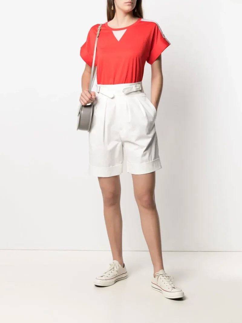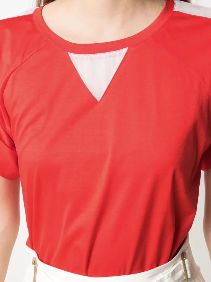 Tricou Lorena Antoniazzi Contrasting-Print rosu, cu guler rotund, maneci scurte, mansete rasucite, panouri contrastante si tiv drept. Potrivit pentru sezonul primavara/vara. 100% bumbac.