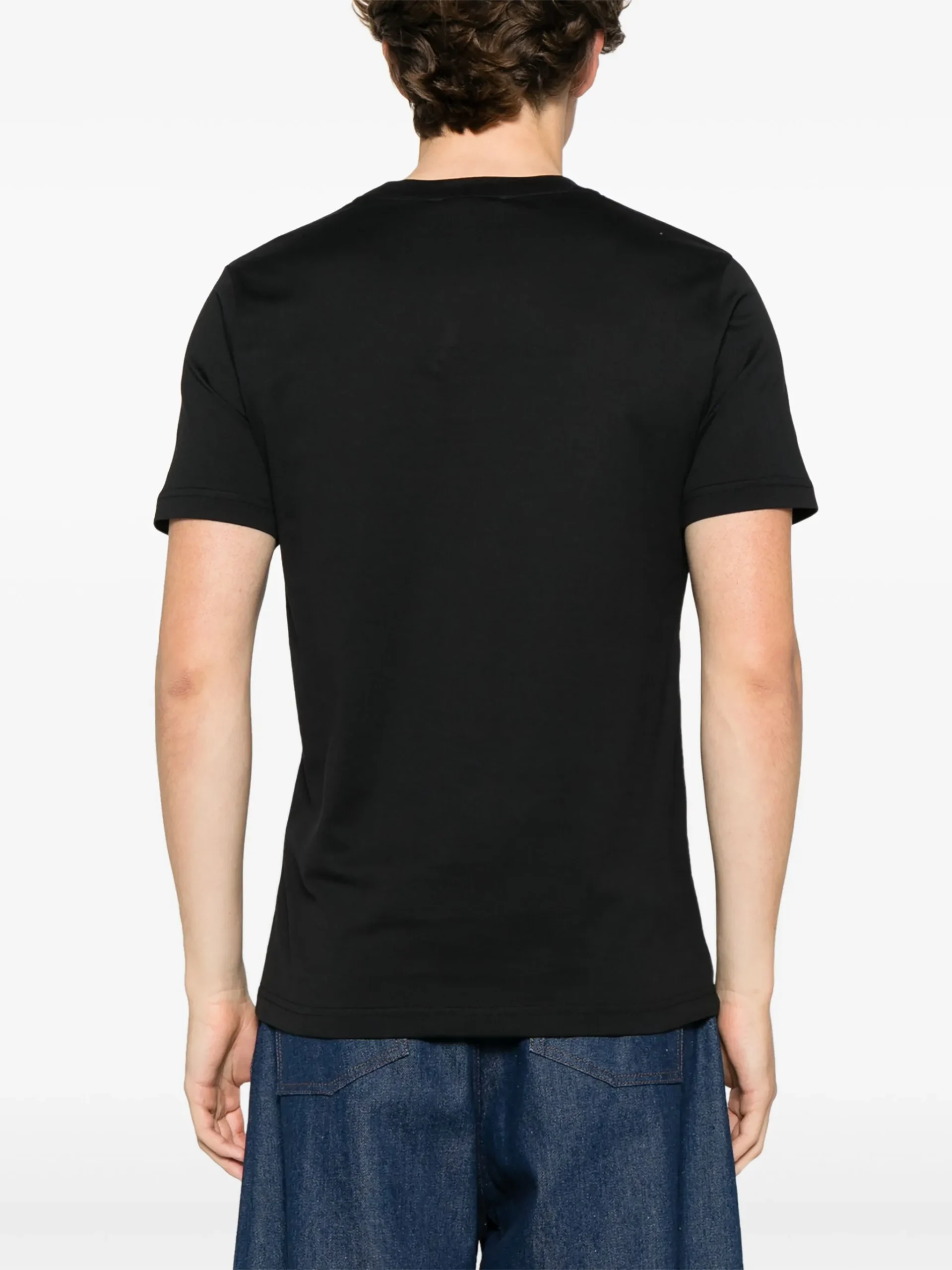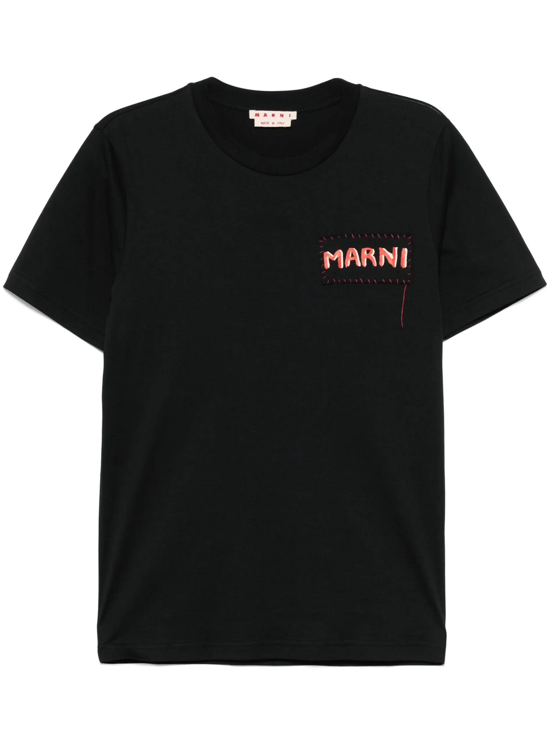 Tricou Marni Jersey negru, guler rotund, maneci scurte, imprimeu cu logo la piept, detaliu cusatura si tiv drept. Potrivit pentru sezonul primavara/vara. 100% bumbac