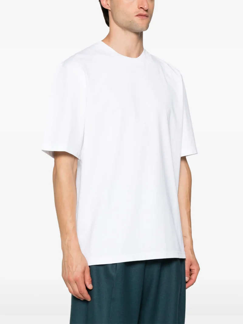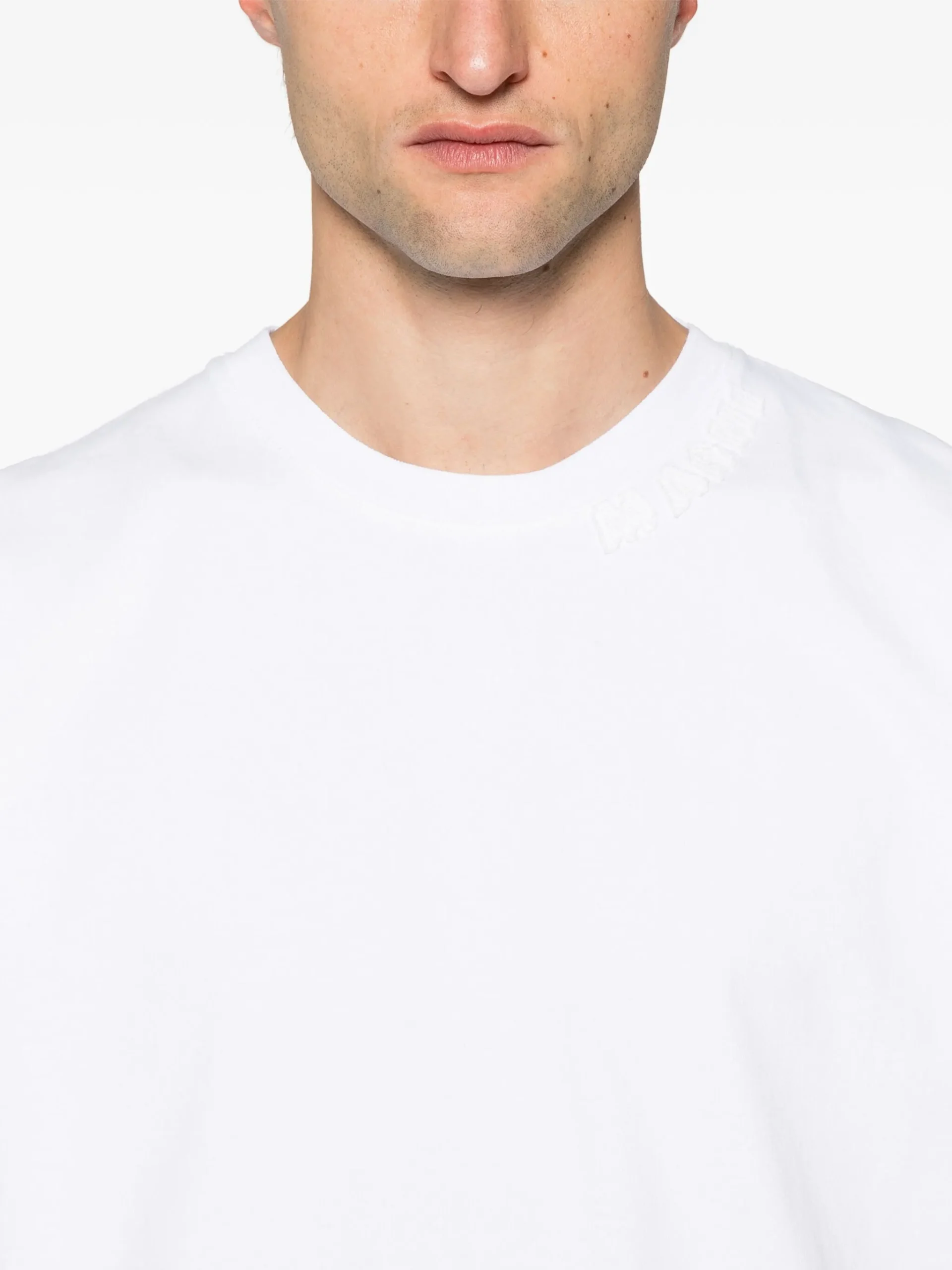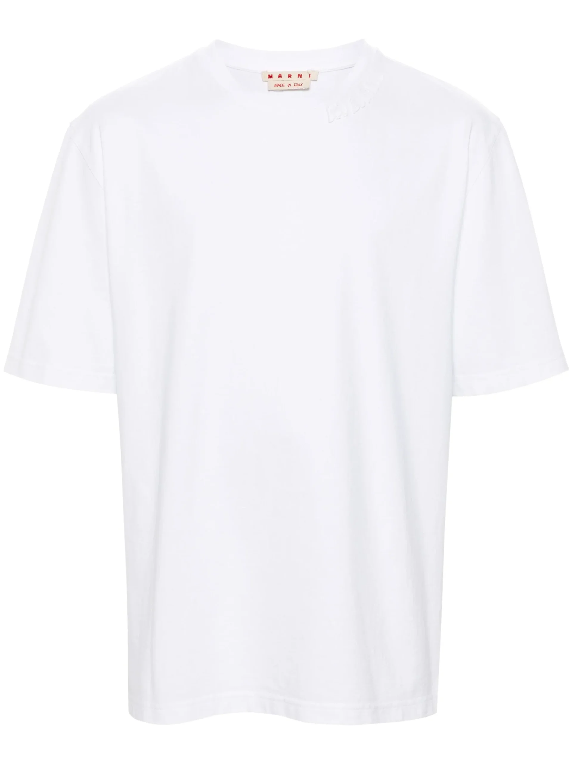 Tricou Marni logo-patch alb, guler rotund, maneci scurte, logo in zona gatului si tiv drept. Potrivit pentru sezonul primavara/vara.100% bumbac