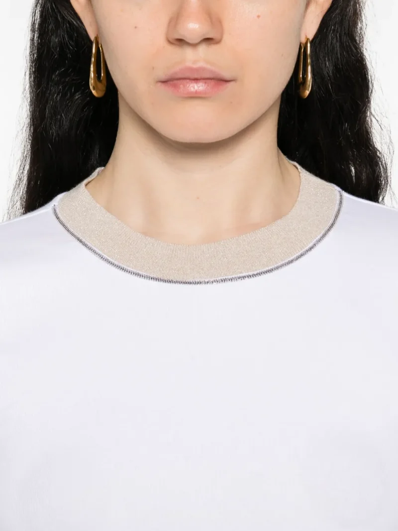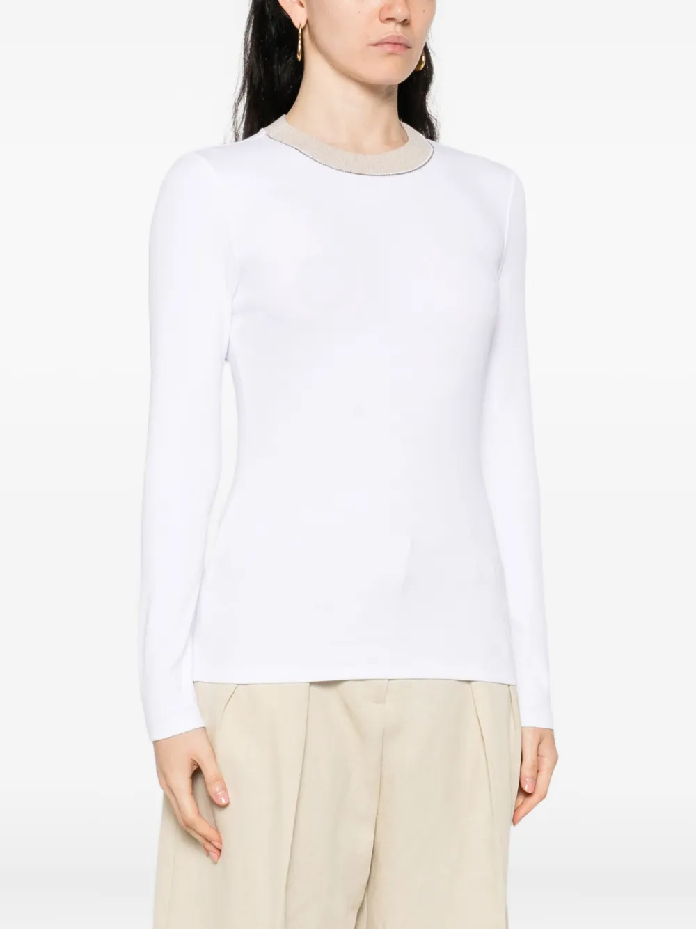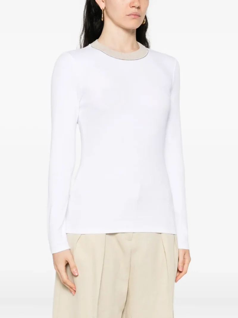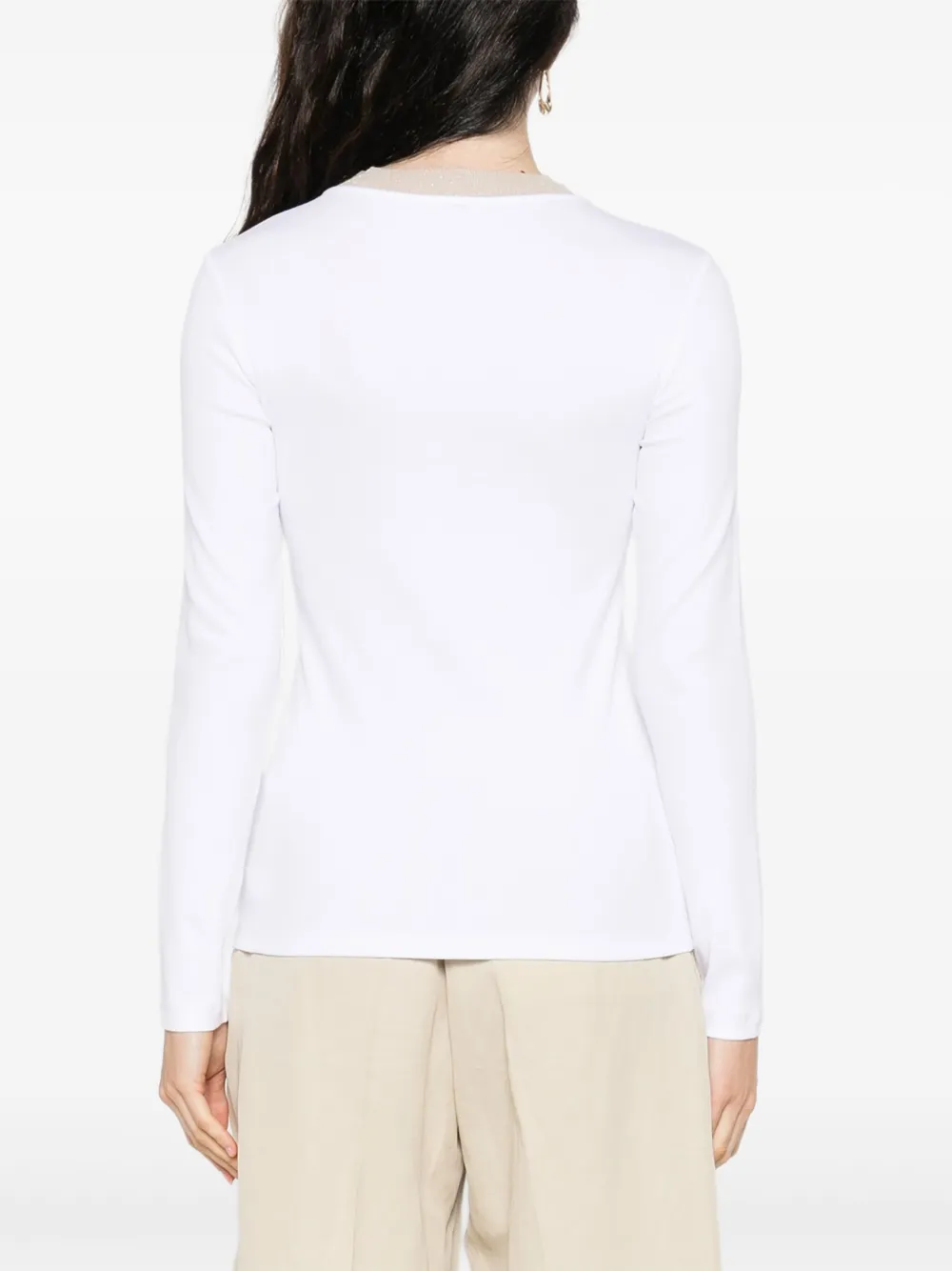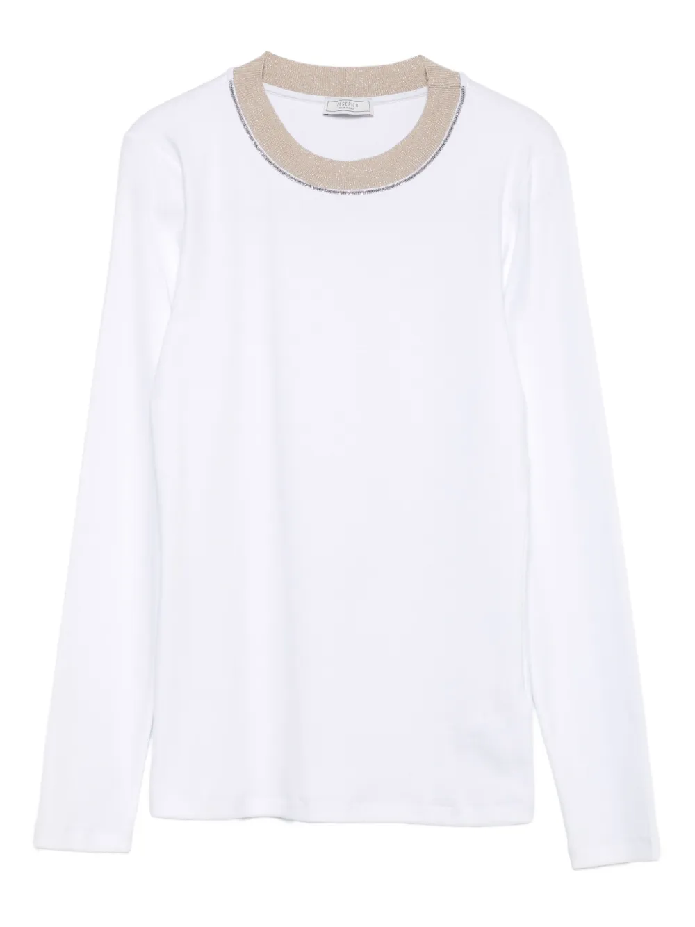Tricou Peserico Embellished-Round-Neck alb, din bumbac, cu guler rotund decorat cu fibre metalice si chainlink, maneci lungi si tiv drept. Potrivita pentru sezonul toamna/iarna. 94% bumbac; 6% elastan.
