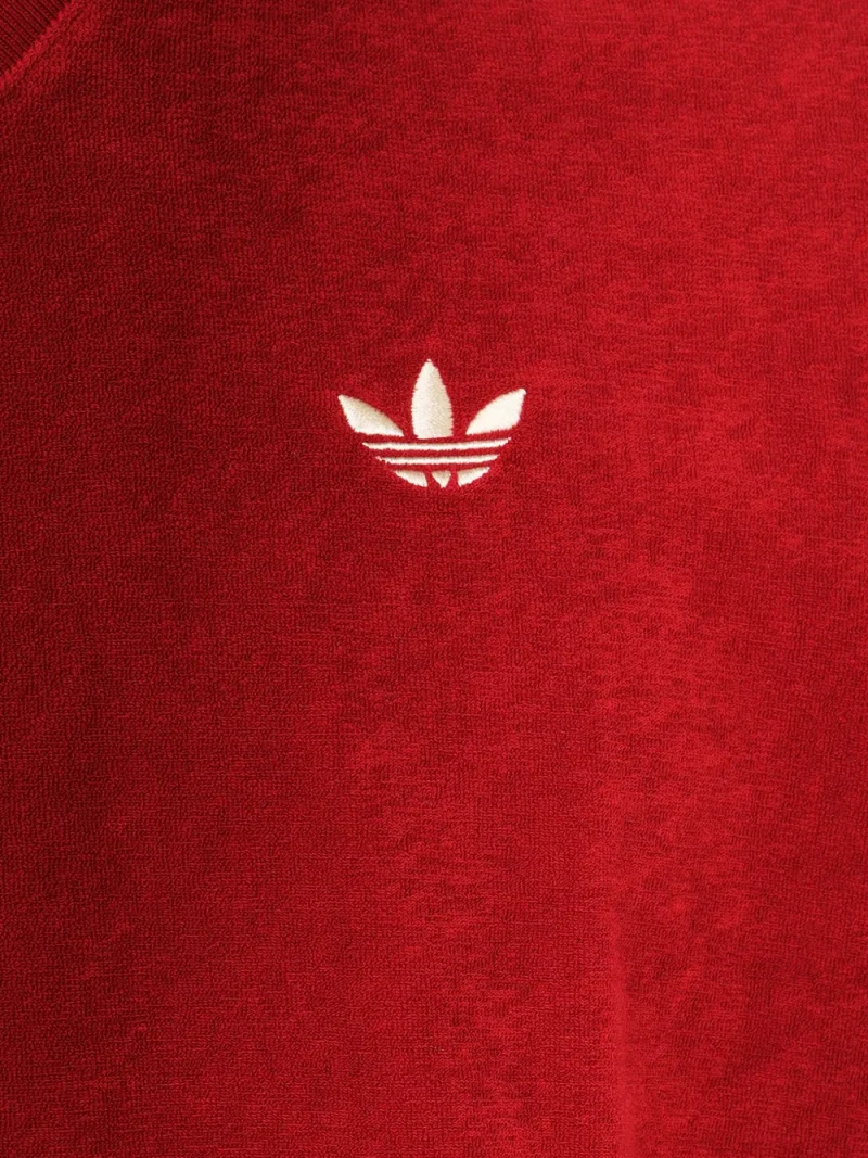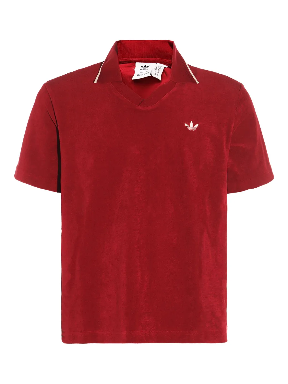 Tricou polo Adidas x Wales Bonner Cotton-Blend visiniu, din material terry texturat, cu guler polo si in V, maneci scurte, dungi contrastante discrete, logo tonal Wales Bonner & Trefoil brodate pe piept si tiv drept. Potrivit pentru sezonul toamna/iarna. 78% bumbac; 22% tereftalat de polietilena (PET).