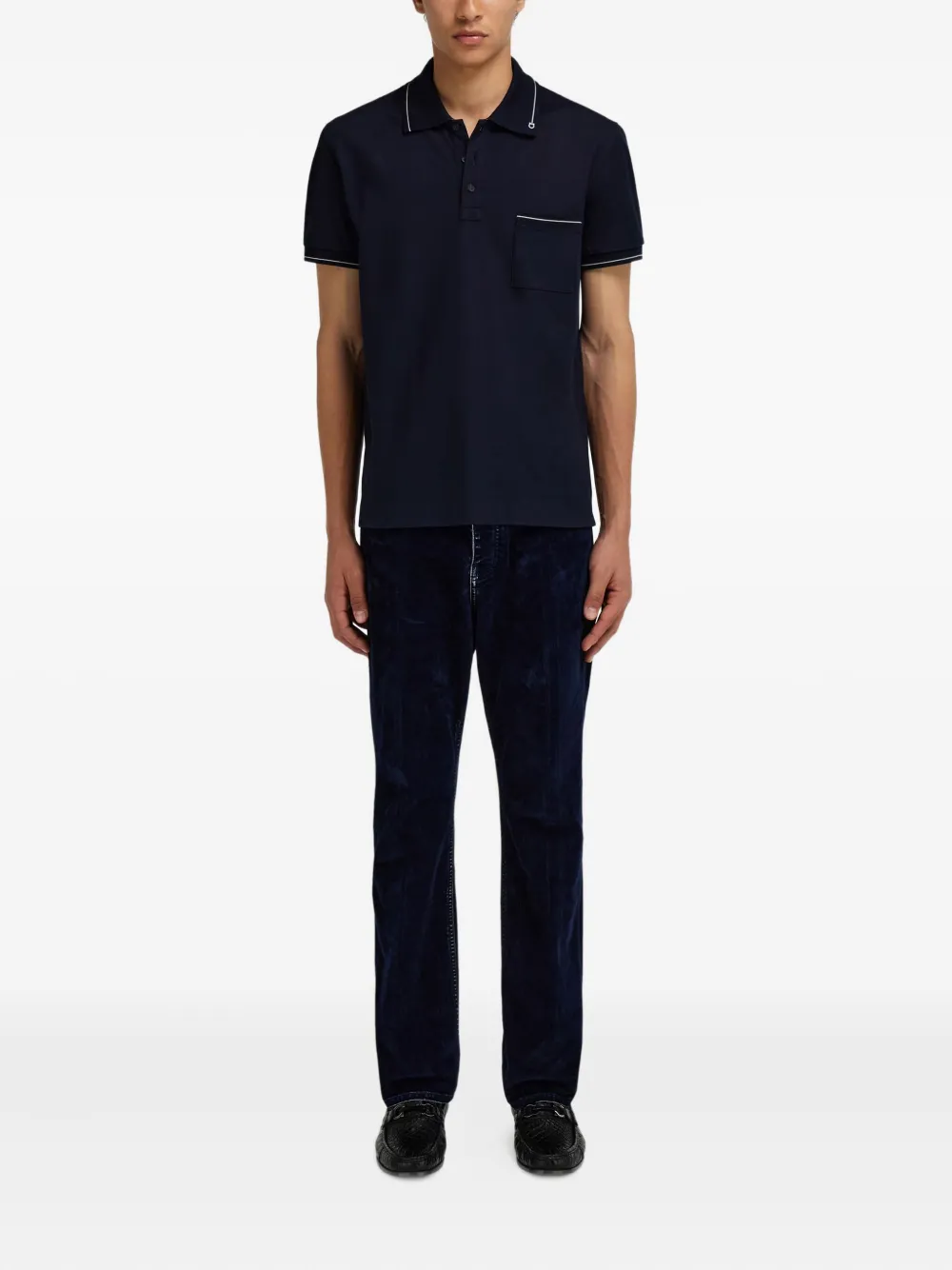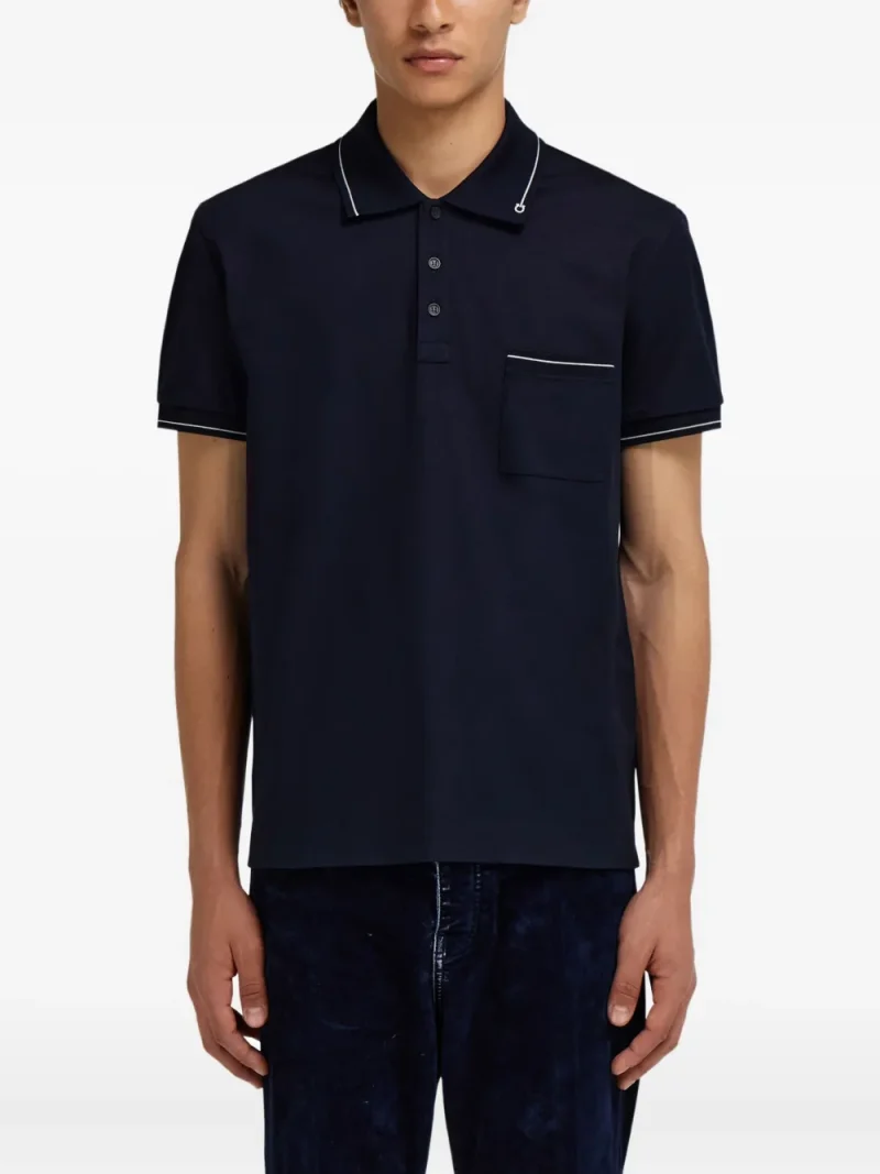 Tricou polo Ferragamo Gancini Pocket Trim bleumarin, realizat din bumbac cu tesatura pique, guler polo, maneci scurte, buzunar la piept, dungi contrastante si tiv drept. Potrivit pentru sezonul primavara/vara. 100% bumbac.