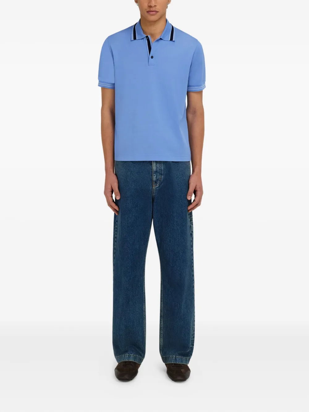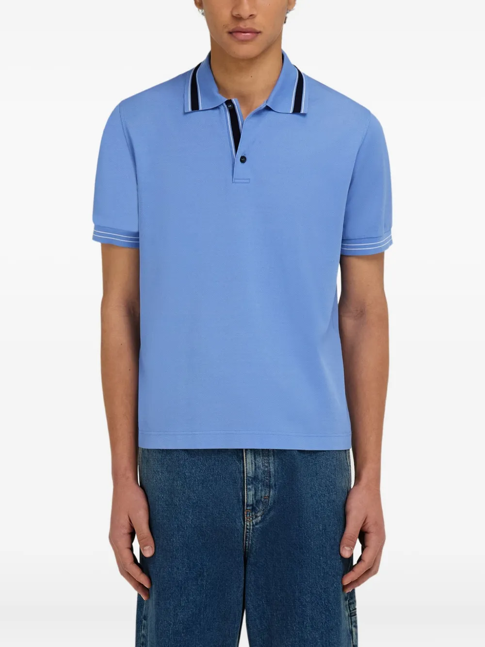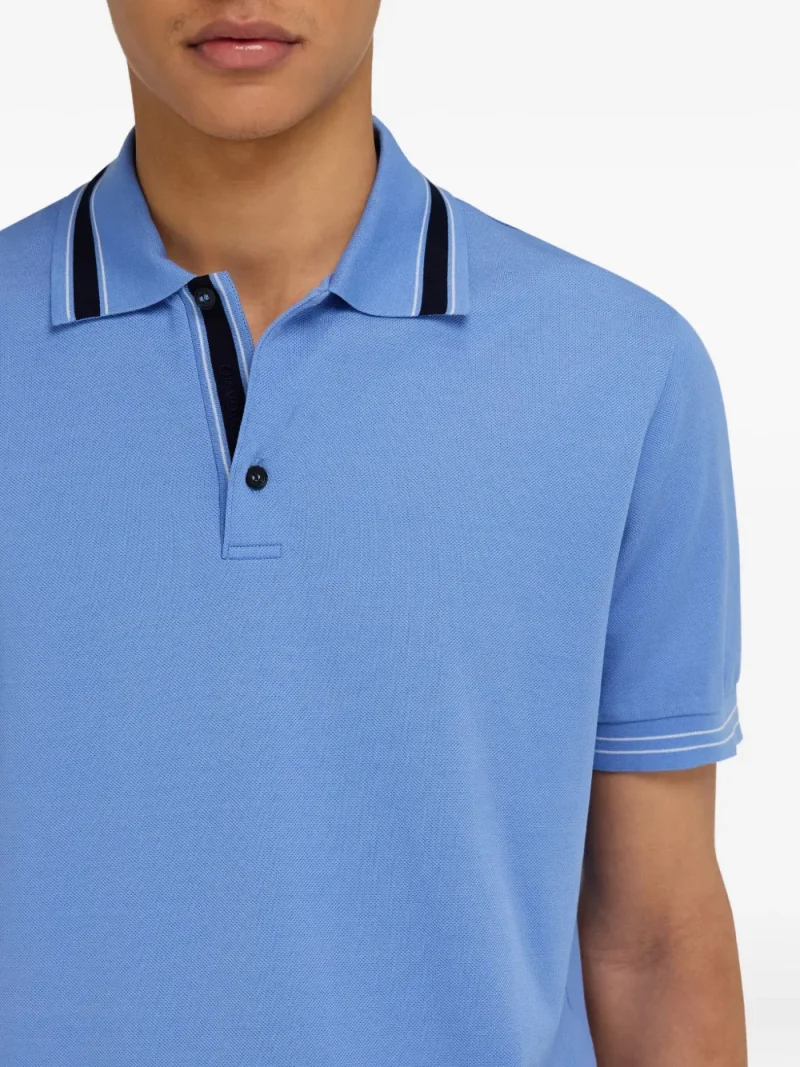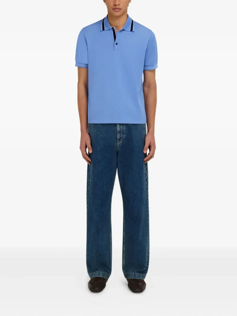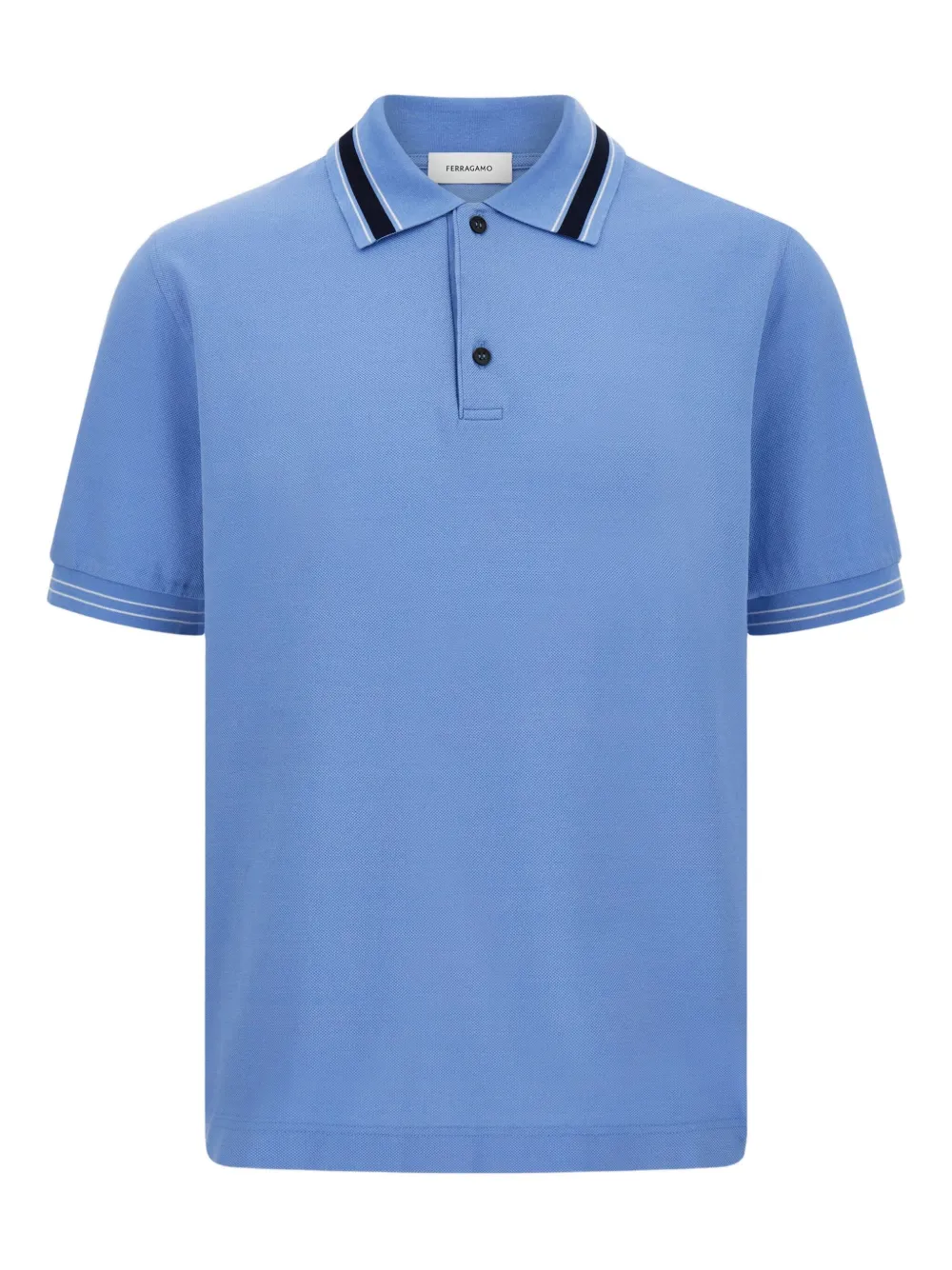 Tricou polo Ferragamo Short-Sleeved albastru, cu guler clasic, inchidere partiala cu nasturi, maneci scurte, mansete elastice, tesatura pique si tiv drept. Potrivit pentru sezonul toamna/iarna. 100% bumbac.