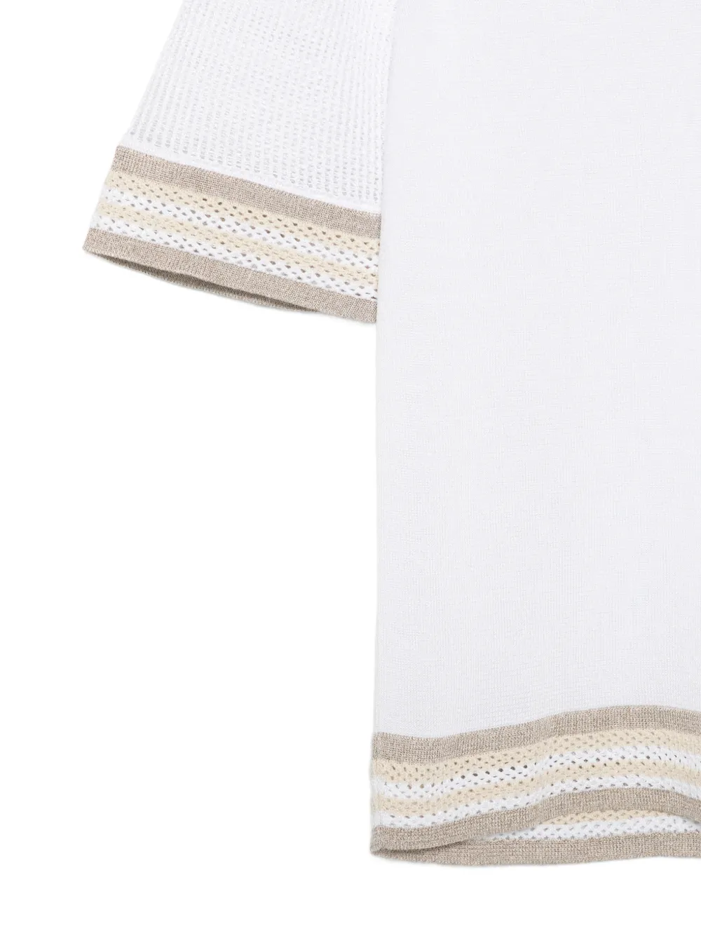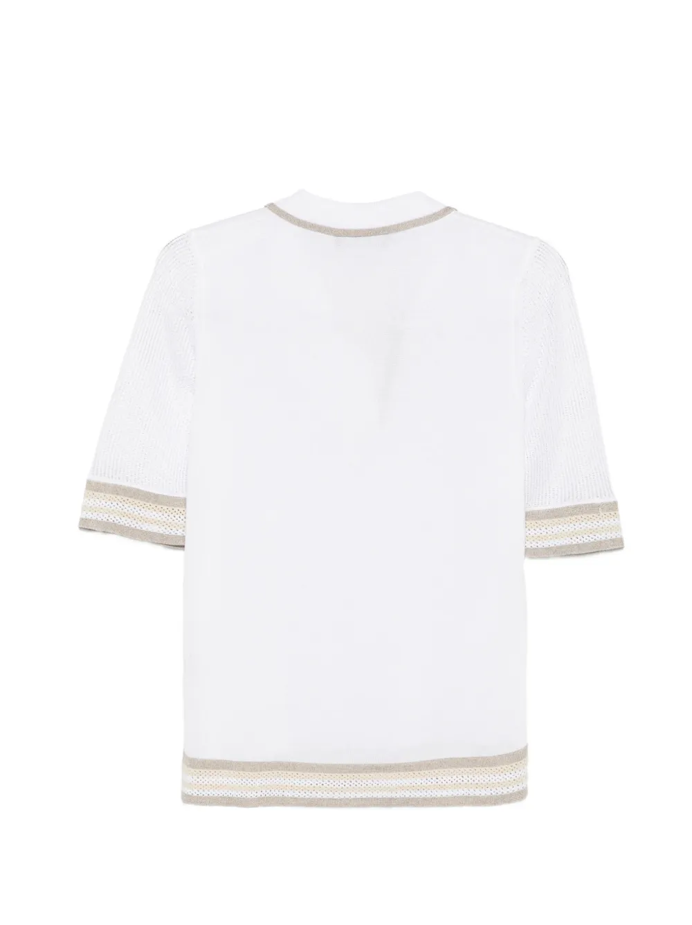 Tricou polo Lorena Antoniazzi Striped alb, tricotat din mix de materiale, cu guler polo, maneci scurte si terminatii ribbed contrastante. Potrivit pentru sezonul primavara/vara. 1% nylon; 1% cauciuc; 47% viscoza; 45% poliester; 6% bumbac.