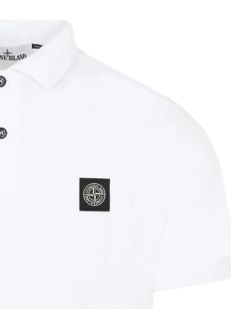 Tricou polo Stone Island Button Patch alb, realizat din bumbac, cu guler polo, inchidere partiala cu nasturi, maneci scurte, logo Compass Badge brodat la piept si tiv drept. Potrivit pentru sezonul primavara/vara. 95% bumbac; 5% elastan.
