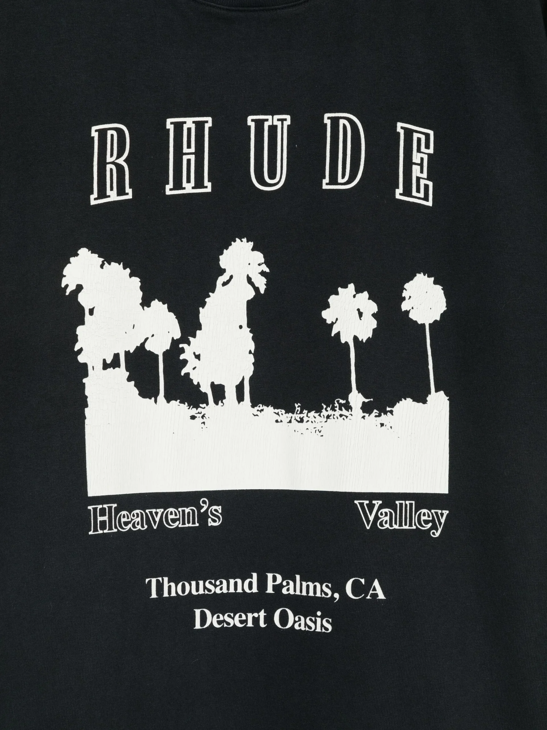 Tricou RHUDE graphic-print negru, imprimeu pe partea din fata, guler rotund si maneci scurte.100% bumbac