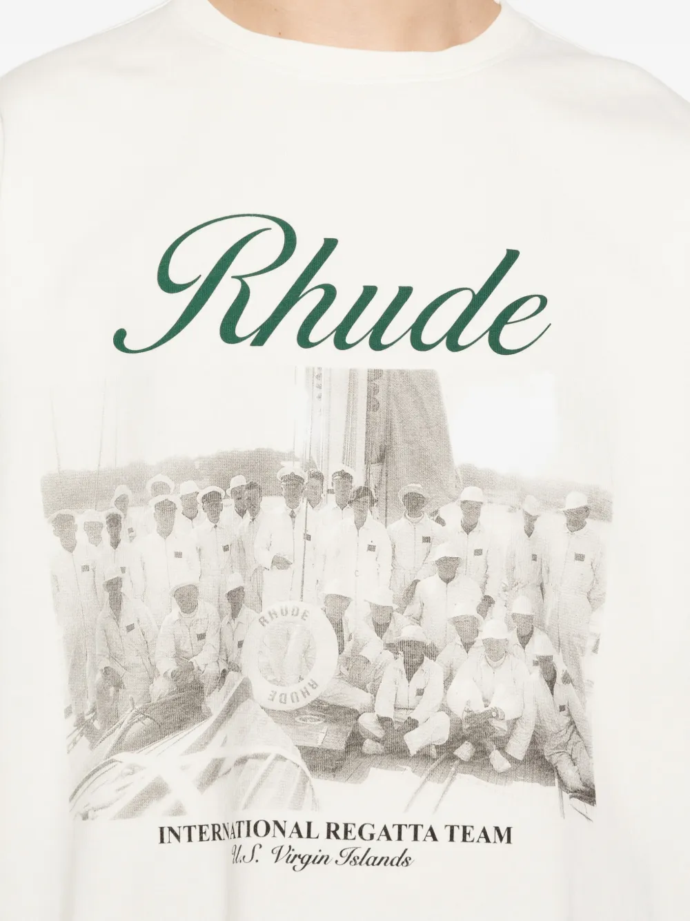 Tricou RHUDE Script Graphic ecru, realizatdin bumbac lavabil, cu guler crewneck, maneci scurte, croiala vintage, grafica Rhude „Virgin Islands” si logo imprimate pe partea superioara si tiv drept. Potrivit pentru sezonul primavara/vara. 100% bumbac.