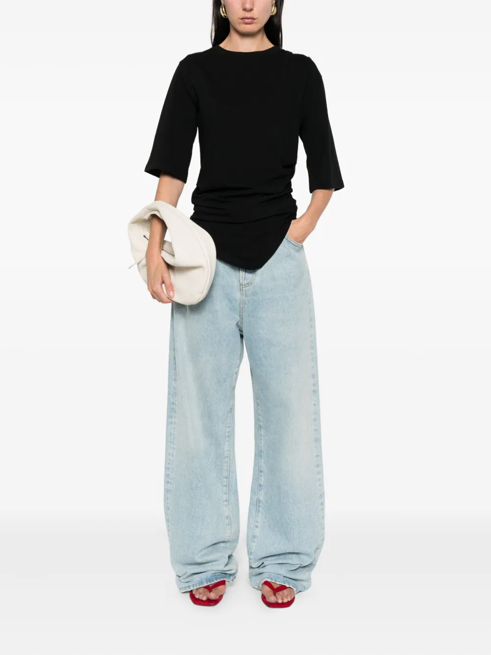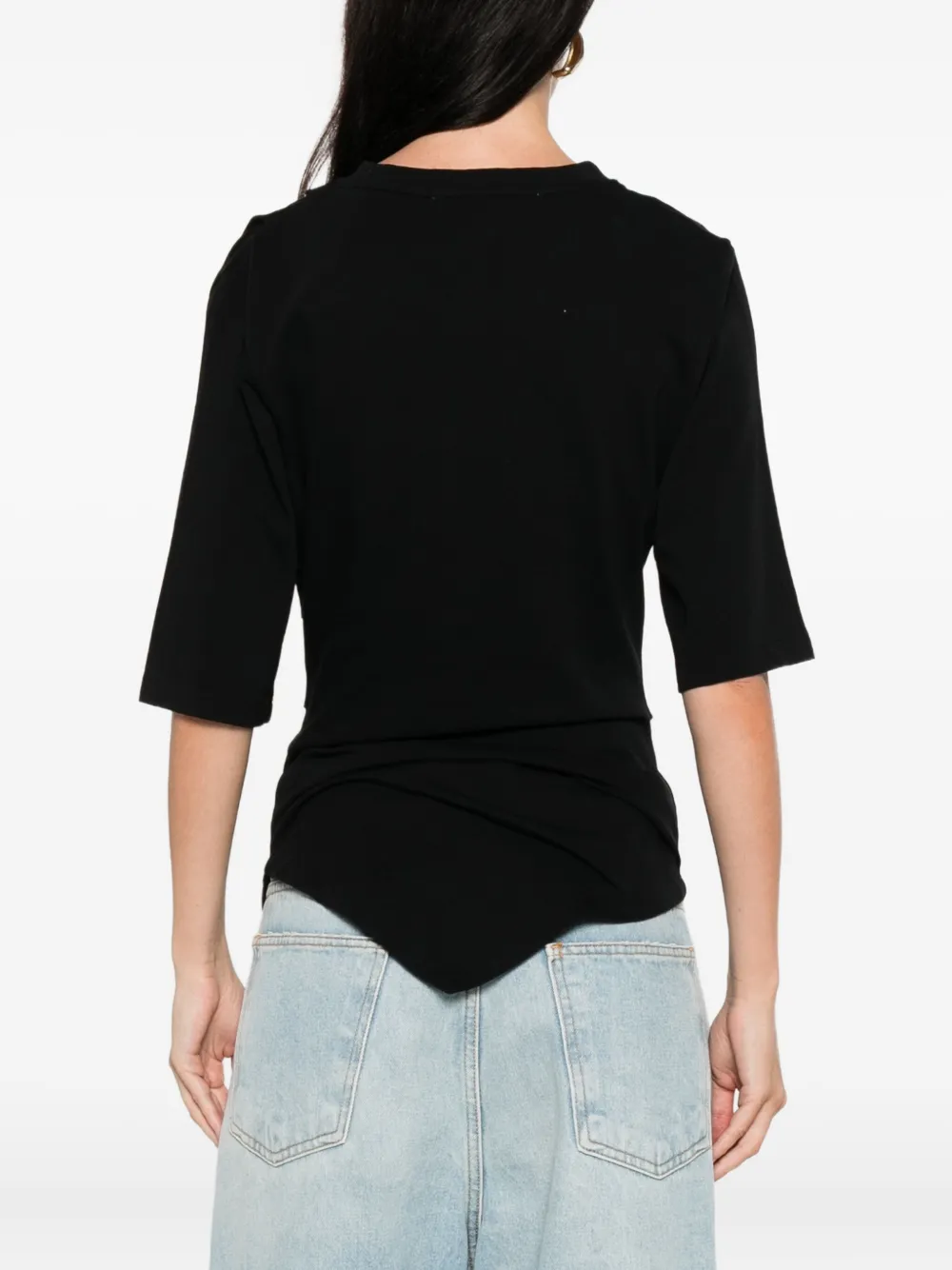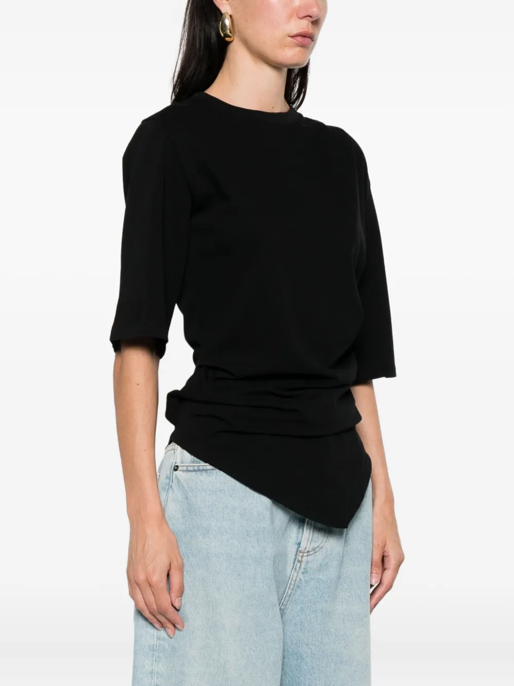 Tricou Rohe Draped negru, realizat din bumbac, cu guler rotund, umeri cazuti, maneci scurte drapate si tiv asimetric. Potrivit pentru sezonul primavara/vara. 100% bumbac organic.