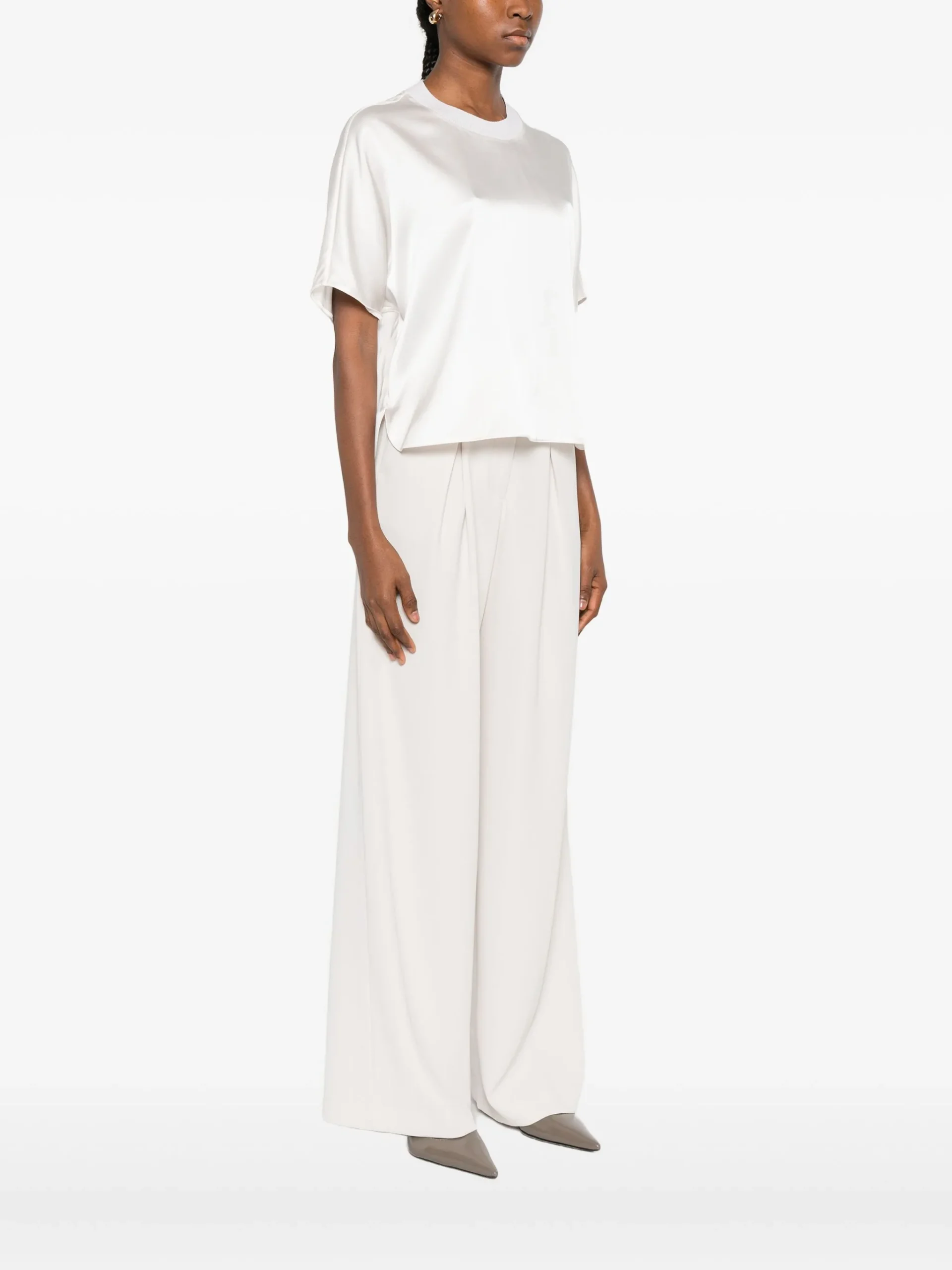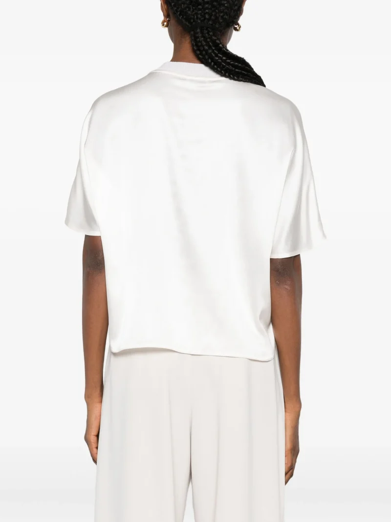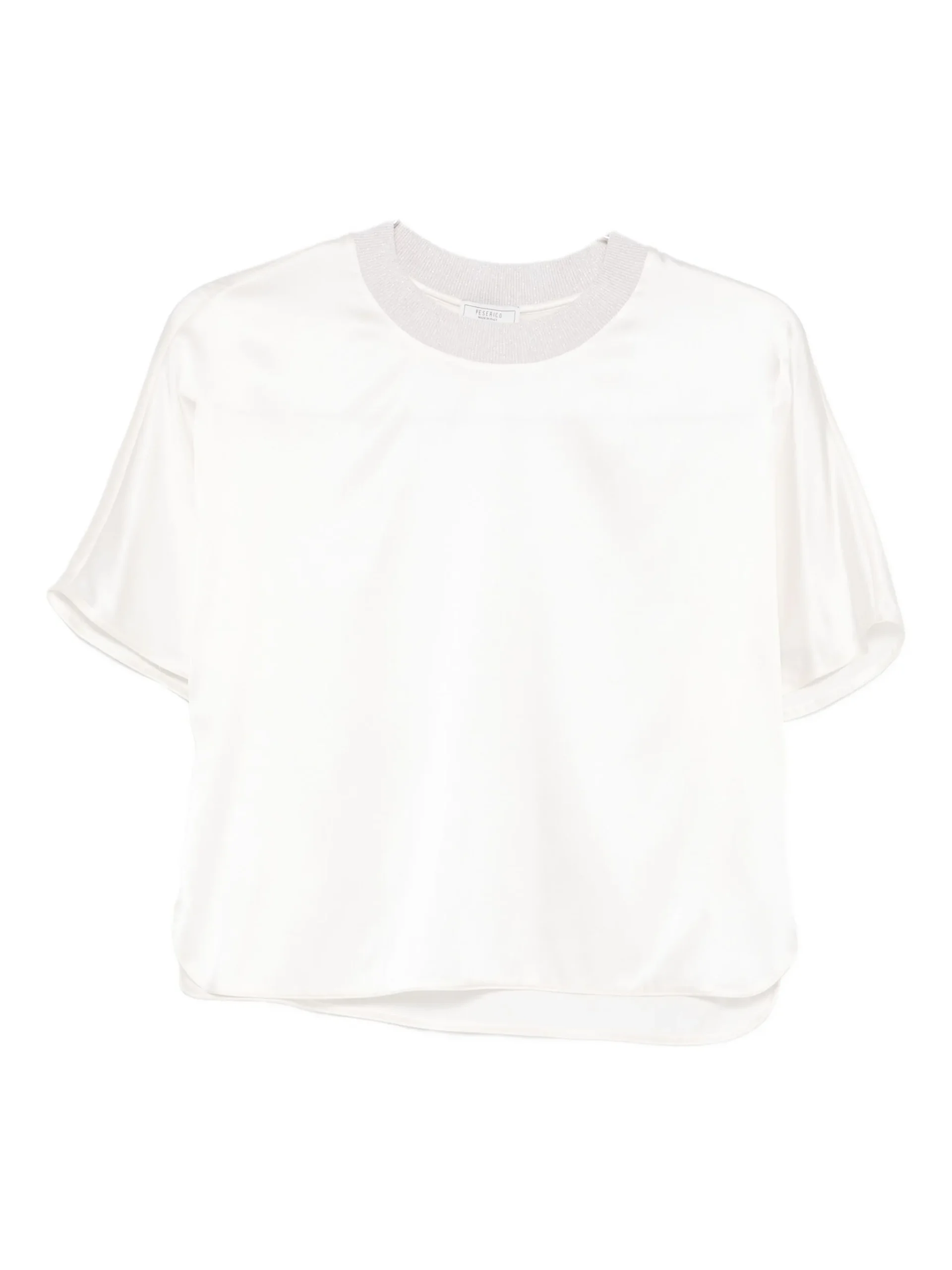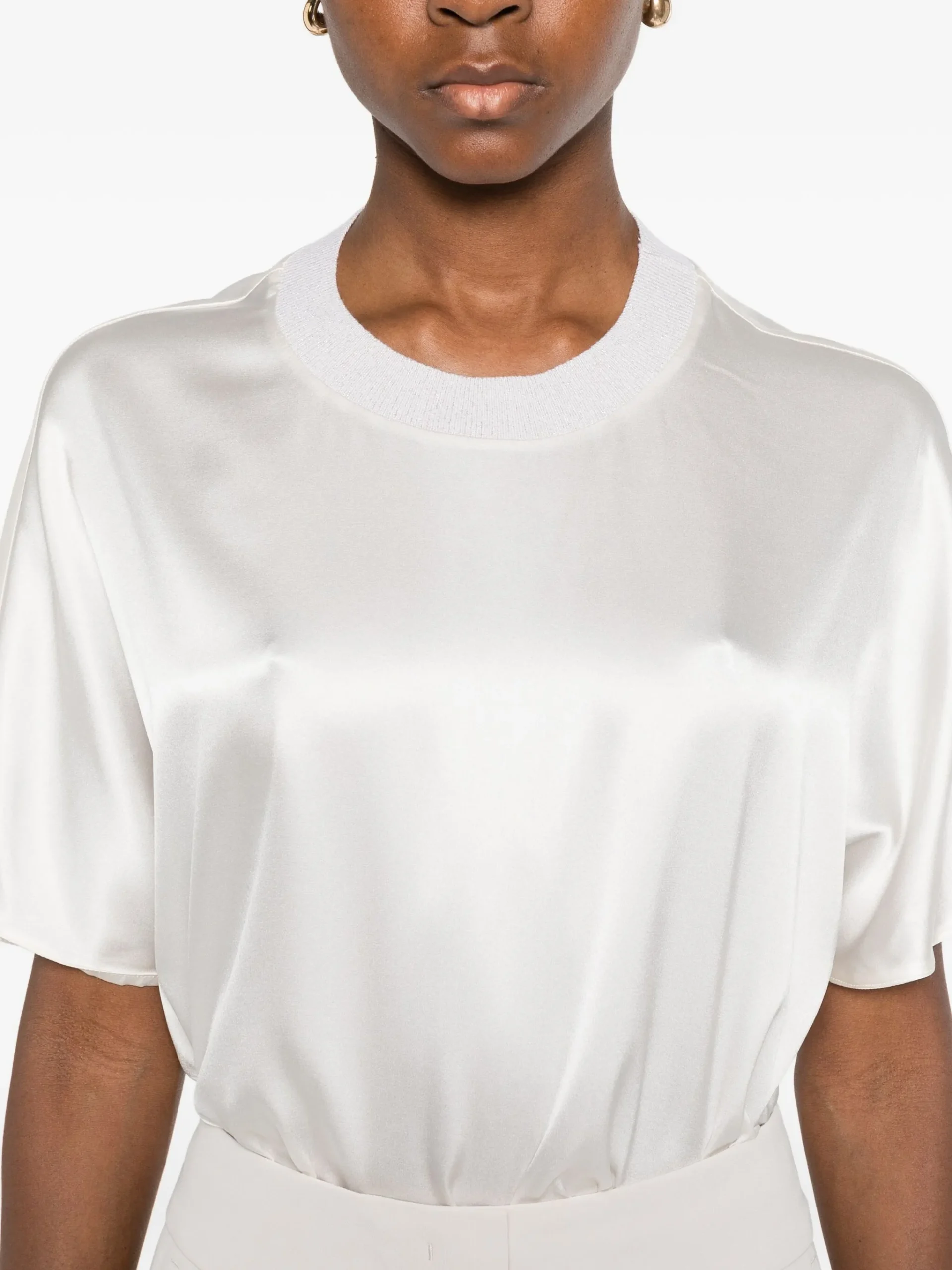 Tricou round-neck silk ecru, guler rotund, maneci scurte si tiv drept.97% matase 3% elastan