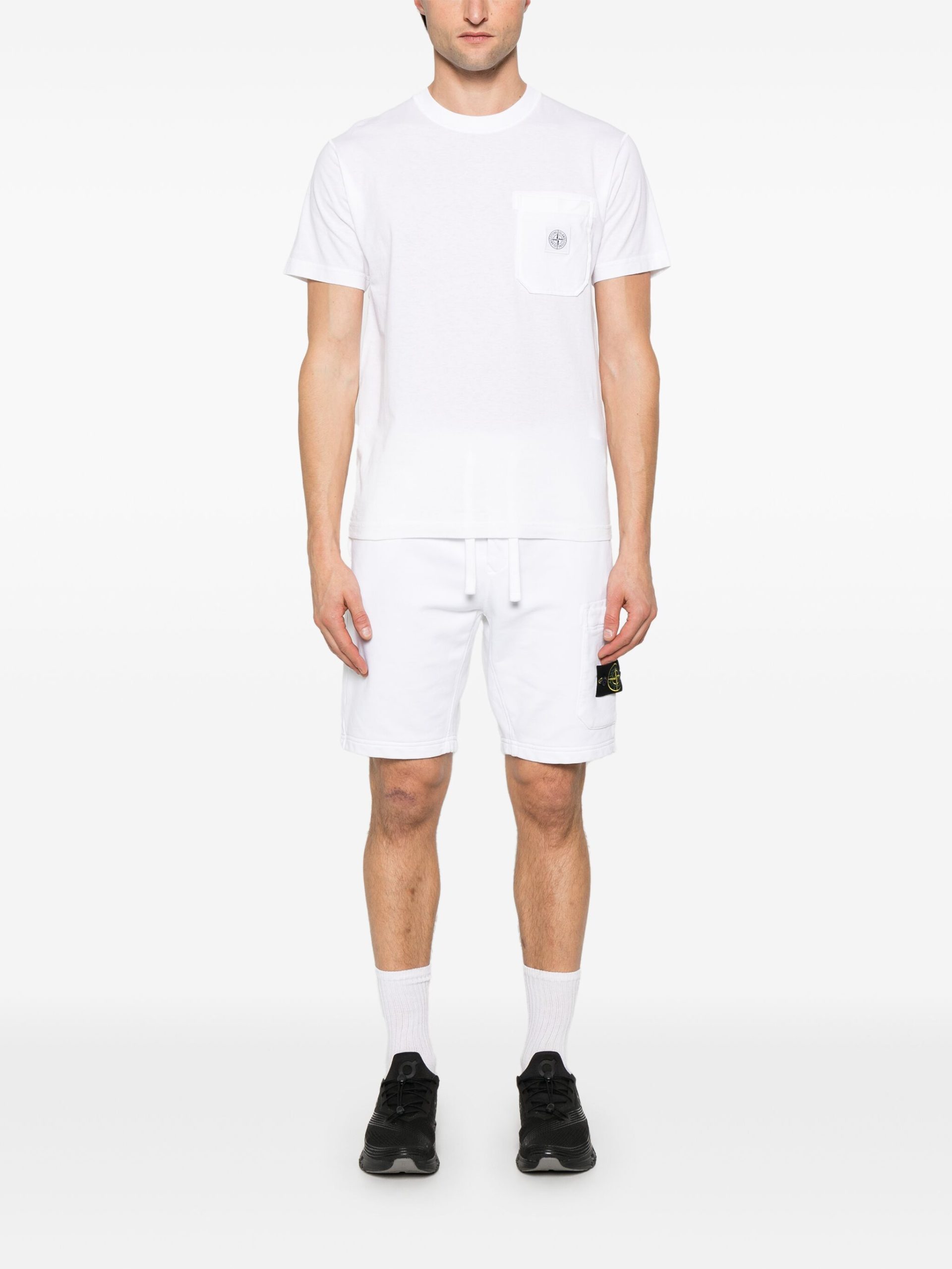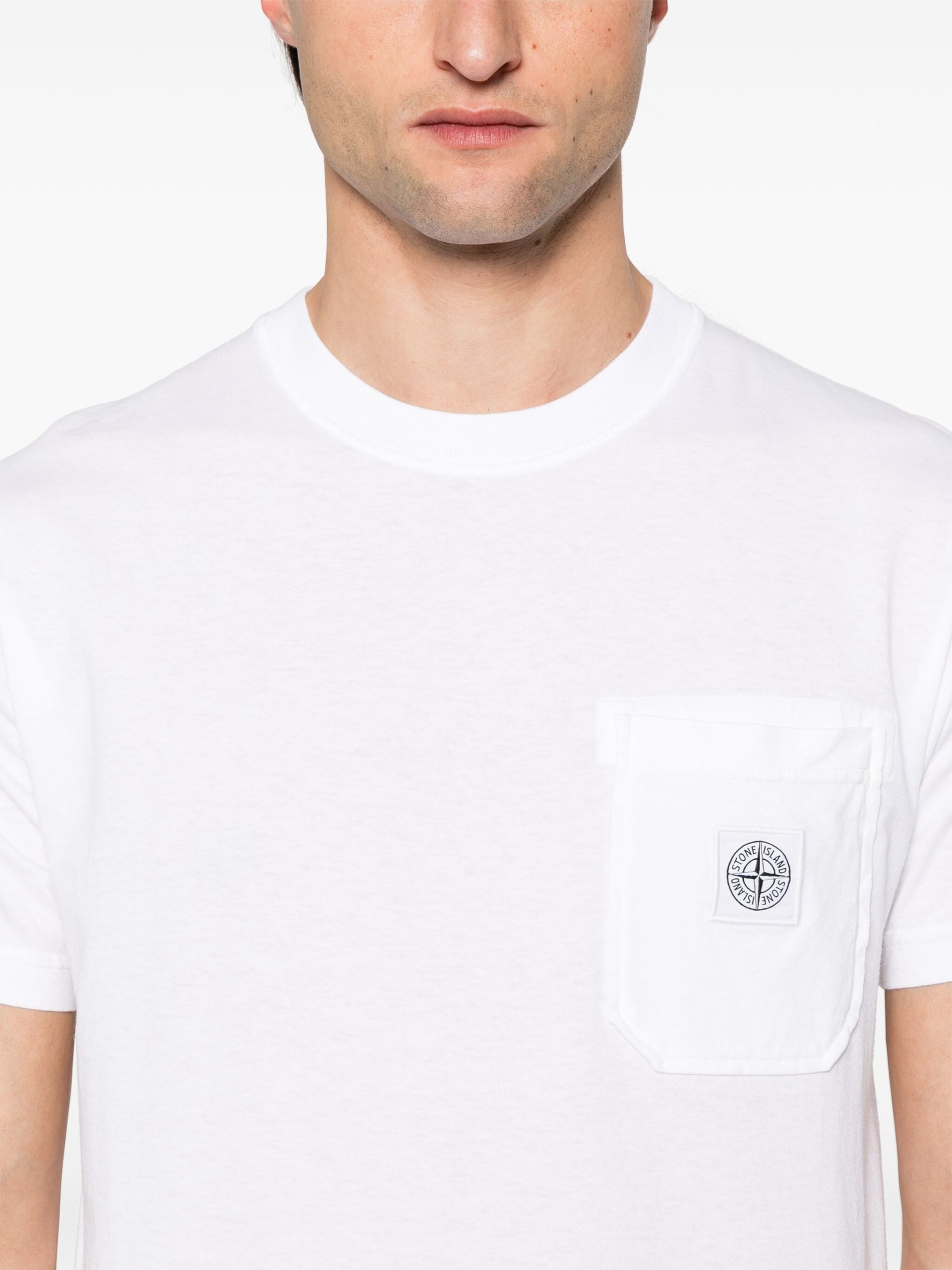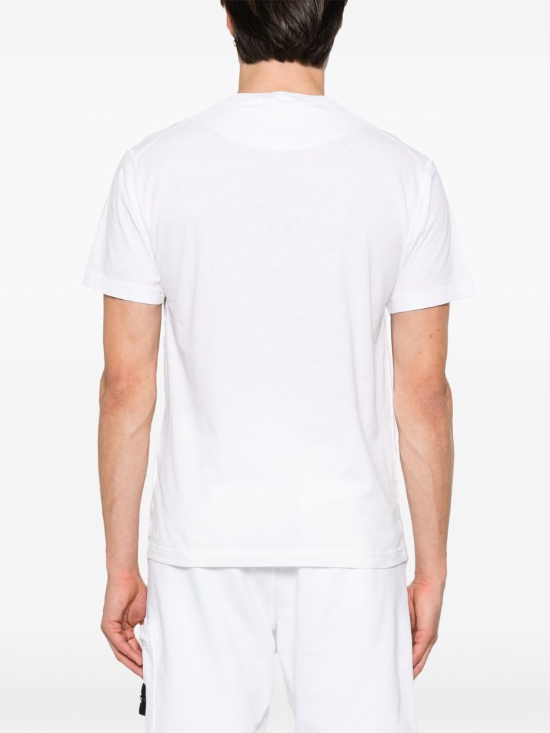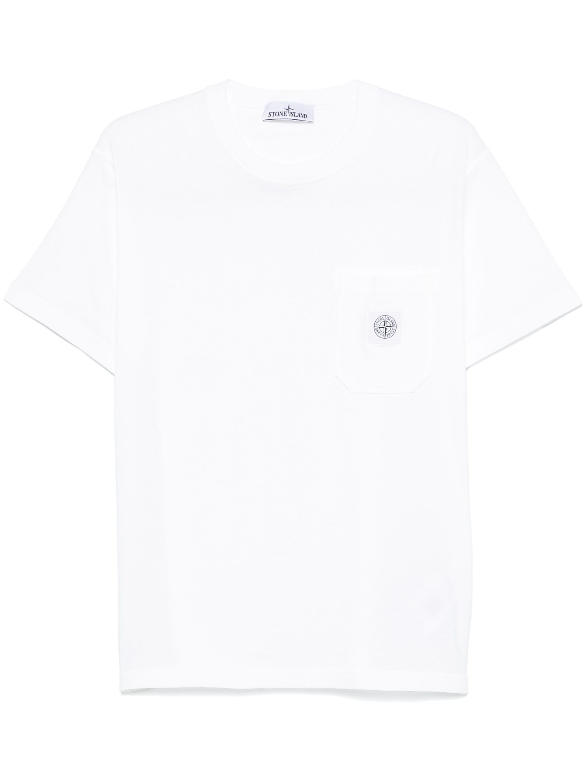 Tricou alb din bumbac cu guler rotund, maneci scurte, buzunar cu logo Stone Island “Compass” pe partea din fata si tiv drept. Potrivit pentru sezonul primavara/vara. 100% bumbac