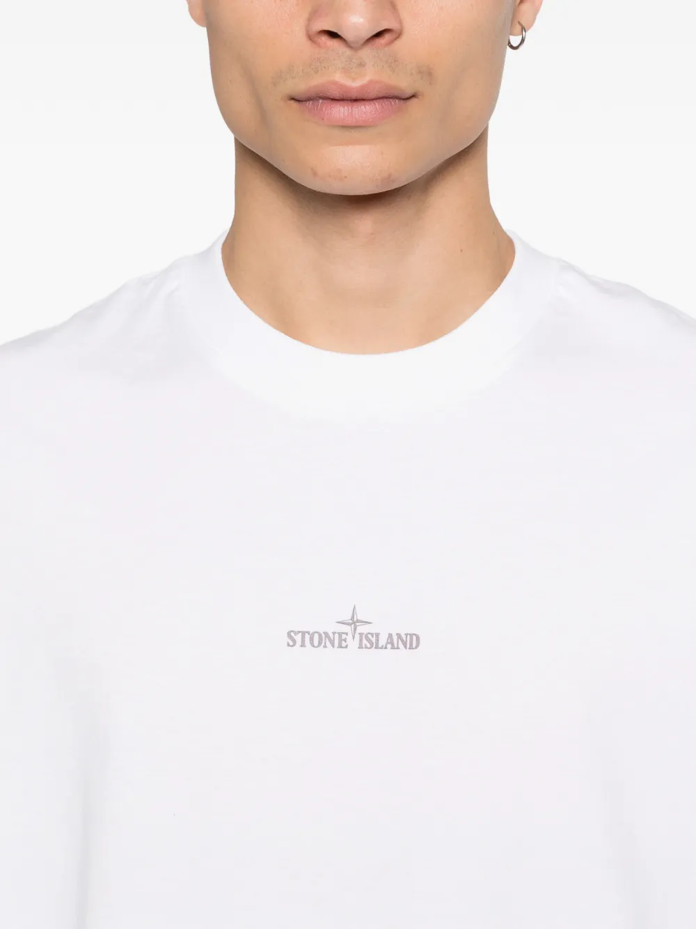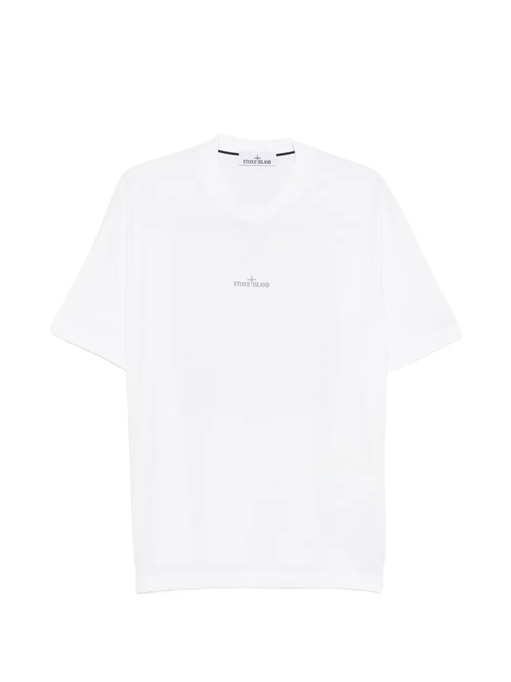 Tricou Stone Island Logo Graphic alb, realizat din bumbac organic, cu guler crewneck, maneci scurte, grafica pe piept si grafica supradimensionata pe spate care il infatiseaza pe Carlo Rivetti la Laboratorul de Culoare Stone Island in1993. Vopsit dupa confectionare. 100% bumbac organic.