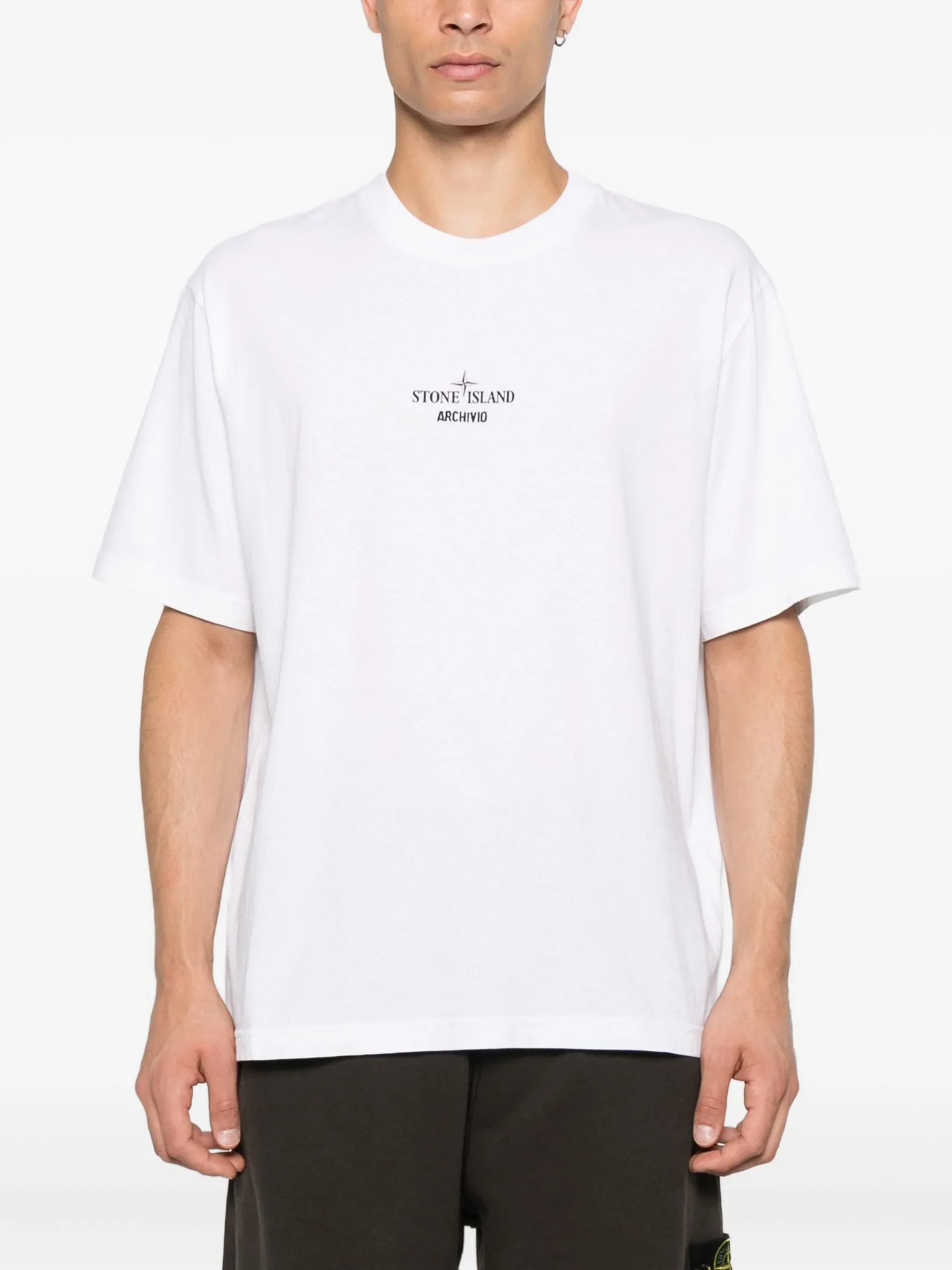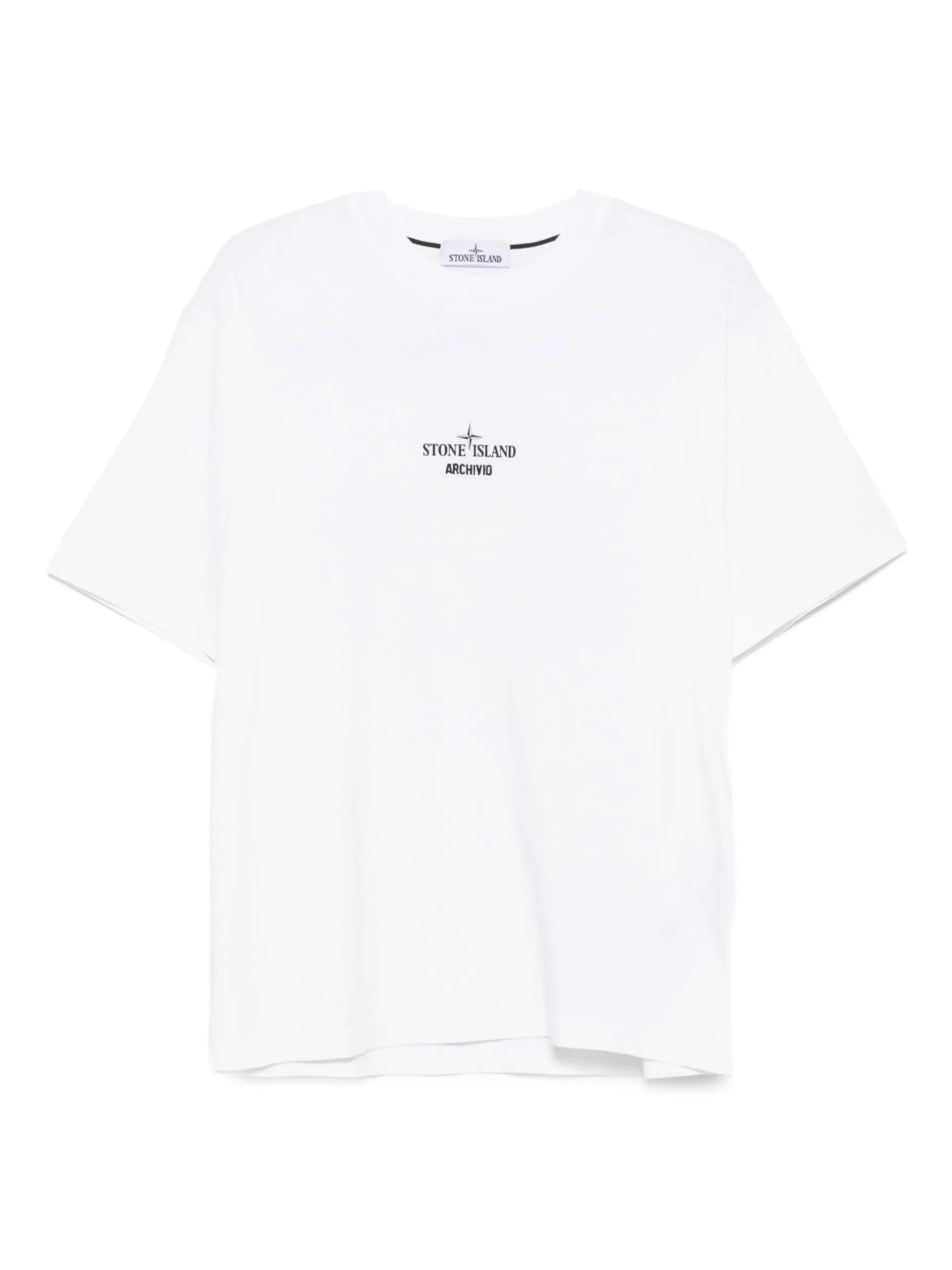 Tricou Stone Island logo-print alb, imprimeu pe partea din fata, imprimeu pe partea din spate, guler rotund, maneci scurte si tiv drept. 100% bumbac