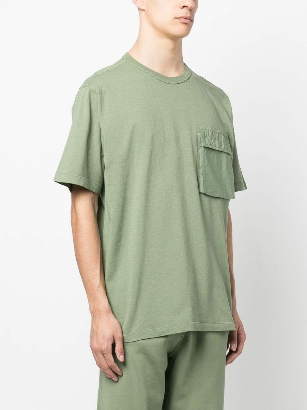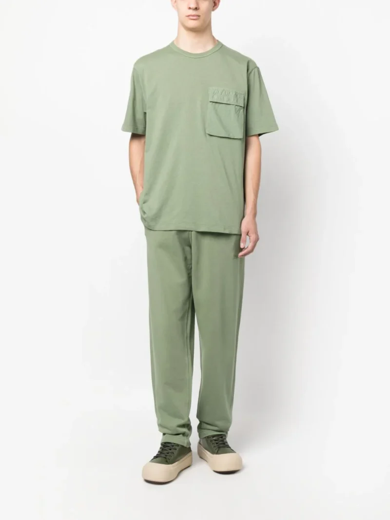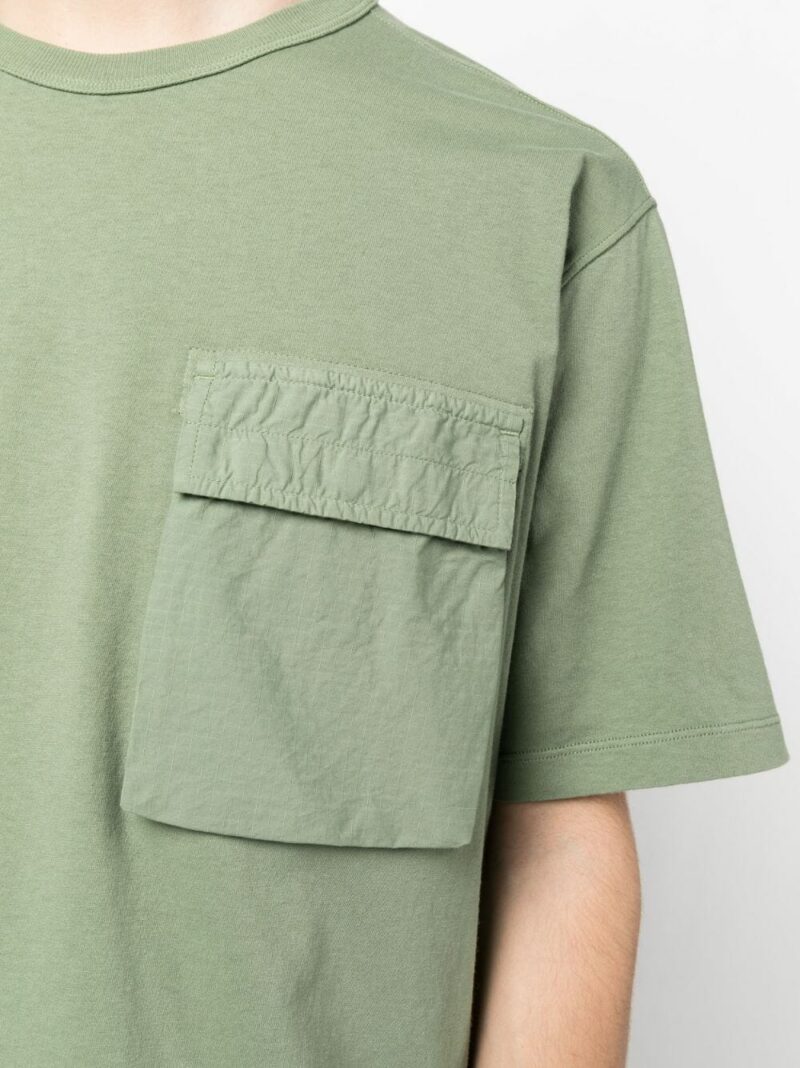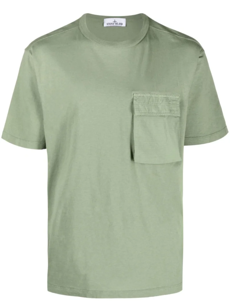 Tricou verde din bumbac organic, cu guler rotund, maneci medii, logo Stone Island imprimat pe partea din spate, buzunar cu capsa pe partea din fata si tiv drept. Potrivit pentru sezonul primavara/vara. Detalii: Garment Dyed. 100% bumbac organic.