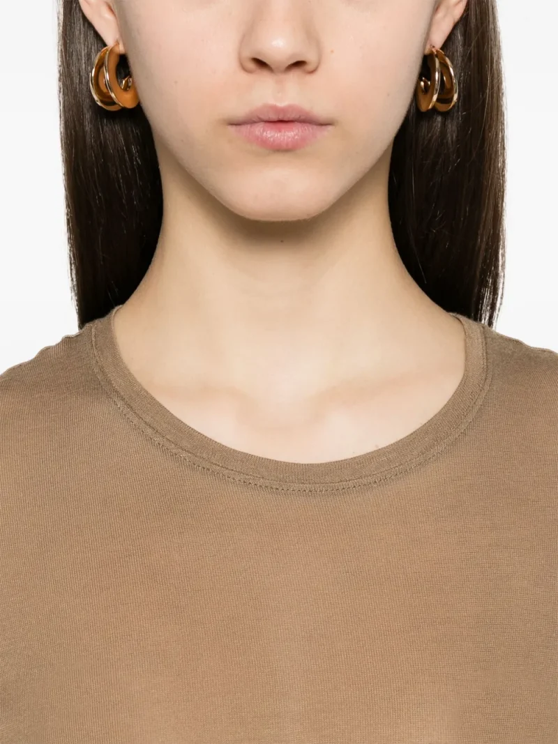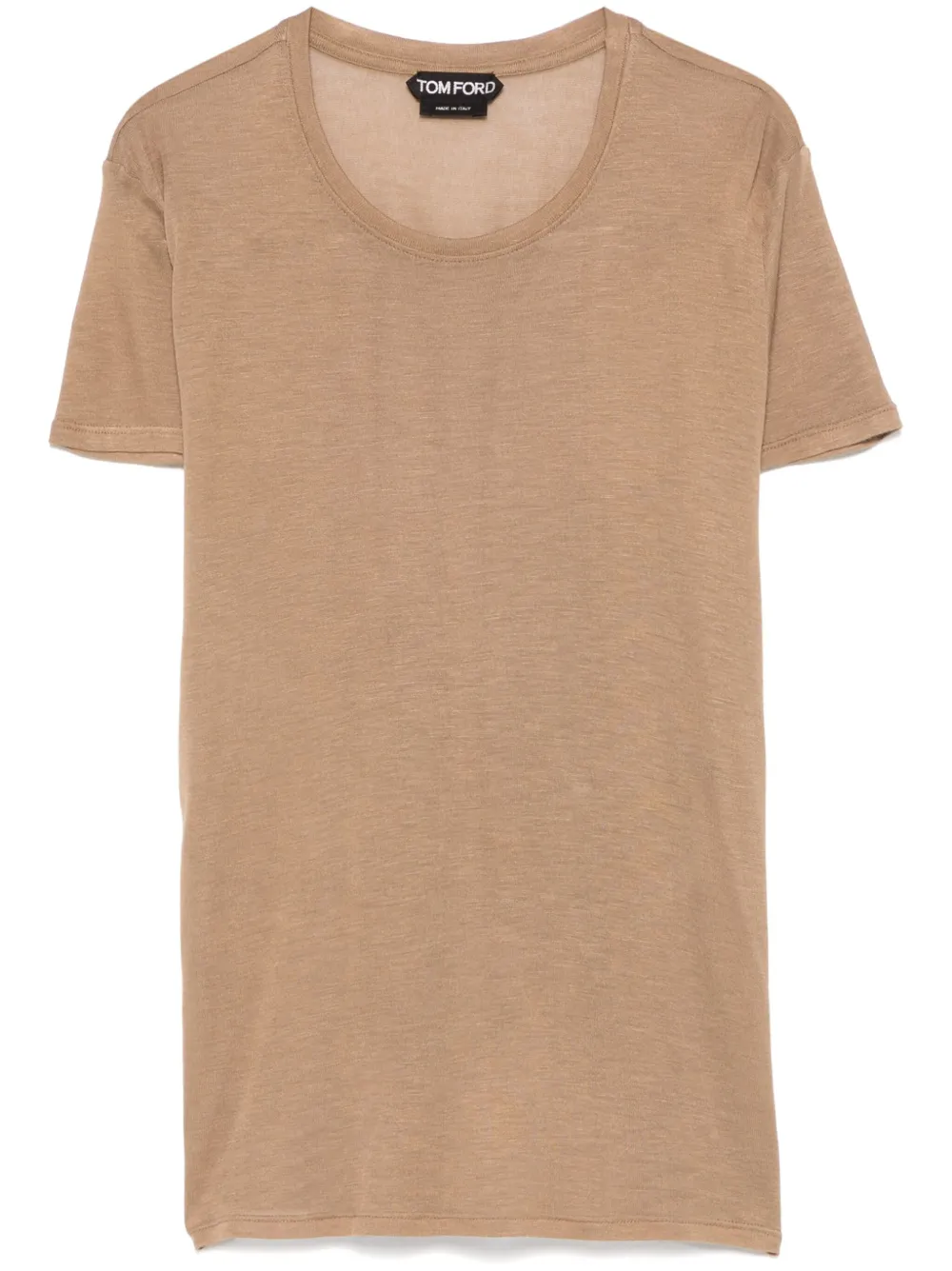 Tricou TOM FORD Semi-Sheer maro, semitransparent, din jerseu bamboo, cu maneci scurte, eticheta loto pe interior si tiv drept. POtrivit pentru sezonul primavara/vara. 100% bamboo.