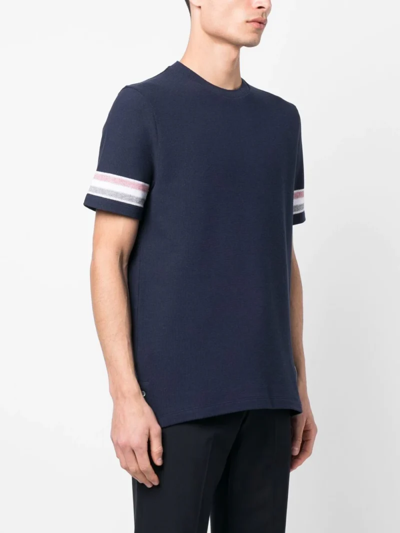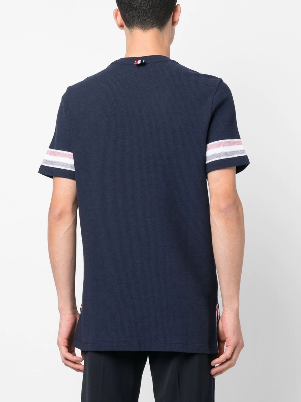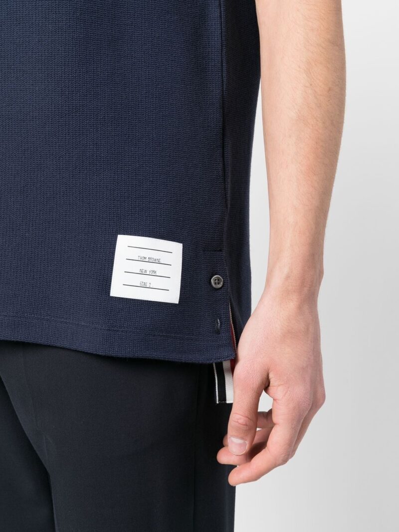 Tricou bleumarin din bumbac, cu guler rotund, maneci scurte, eticheta Thom Browne cusuta si tiv drept cu nasturi. Potrivit pentru sezonul primavara/vara. 100% bumbac.