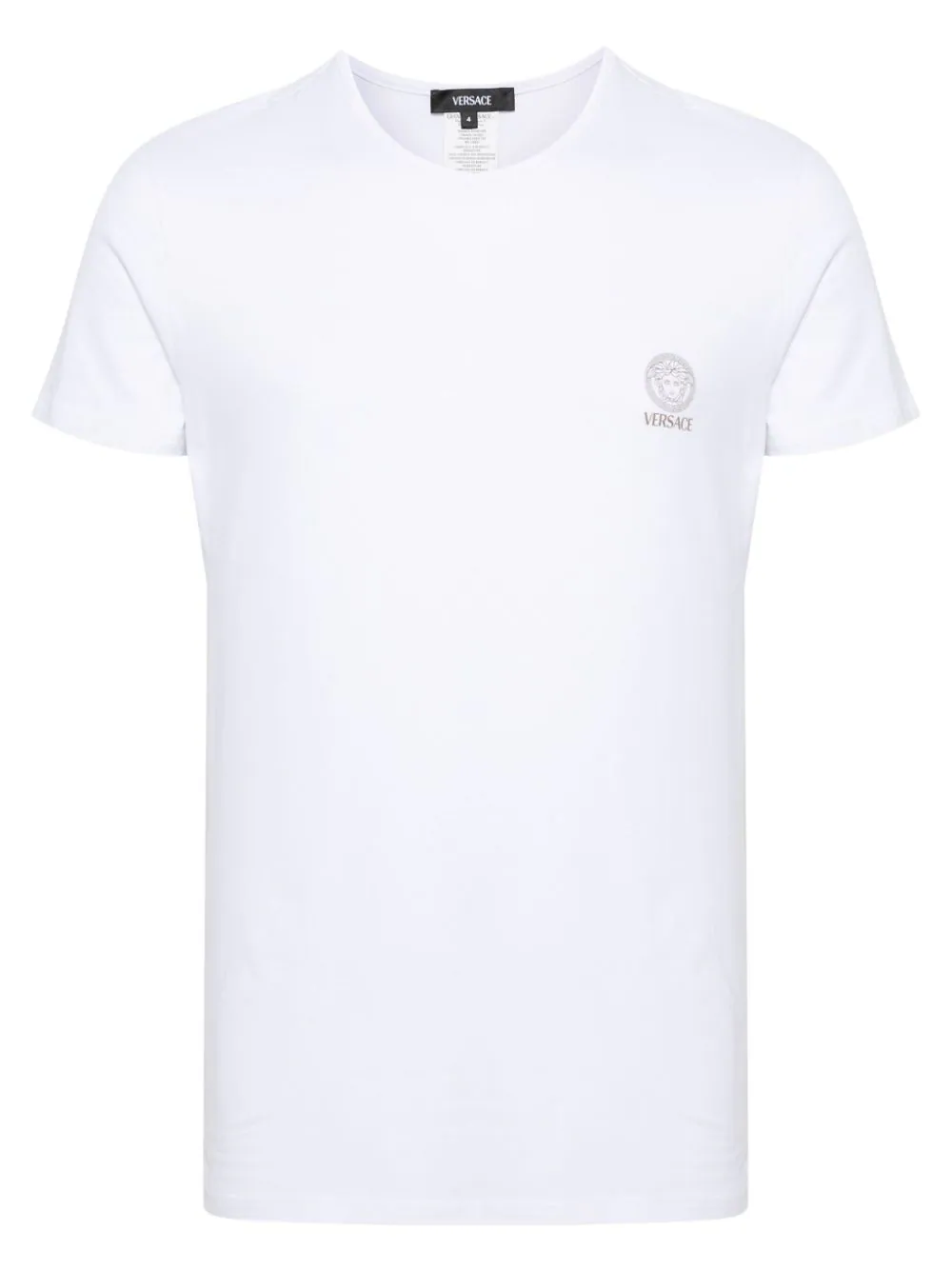 Tricou alb din jerse de bumbac, cu guler rotund, maneci scurte, logo Versace Medusa imprimat la piept, eticheta Versace cusuta pe interior, tesatura elastica si tiv drept. Detalii: Set format din 2 tricouri. Potrivit pentru sezonul primavara/vara. 94% bumbac; 6% elastan.