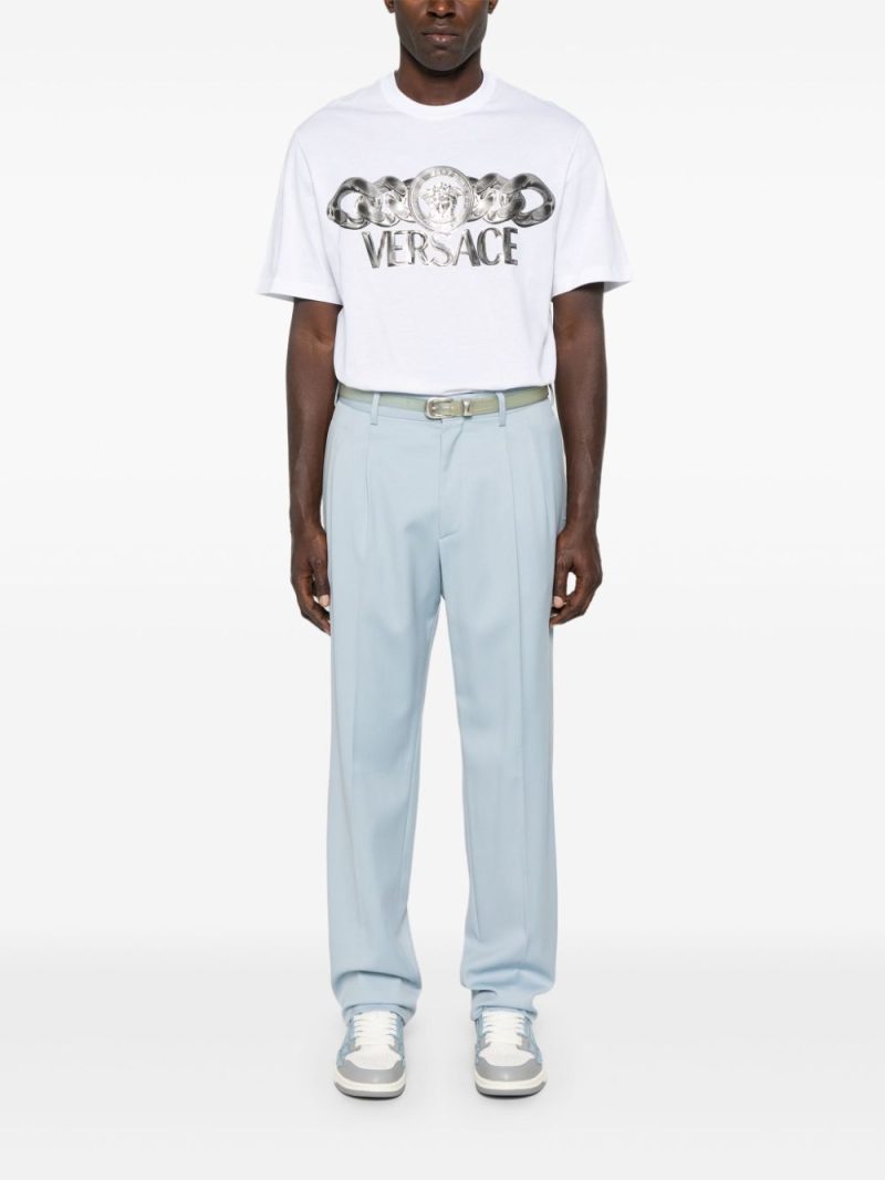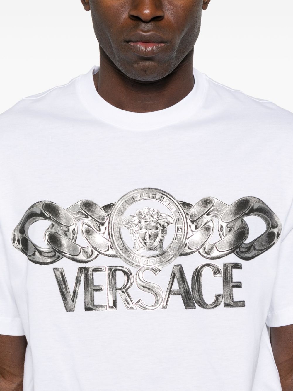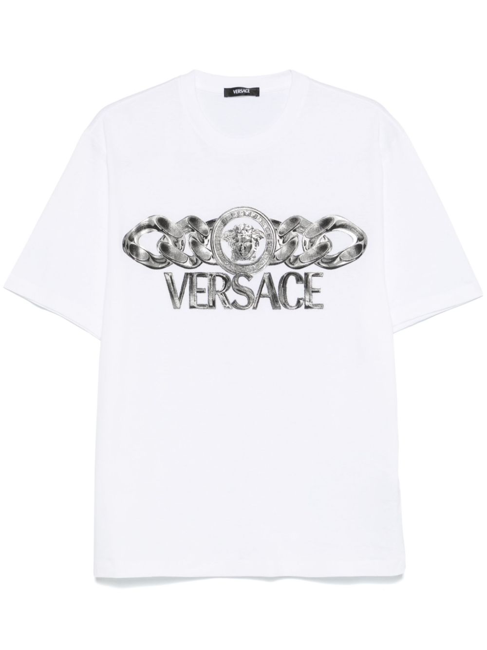 Tricou Versace Medusa Head-Print alb, din bumbac, cu umeri cazuti, maneci scurte, grafica Medusa Chain imprimata pe partea din fata si tiv drept. Potrivit pentru sezonul primavara/vara. 100% bumbac.